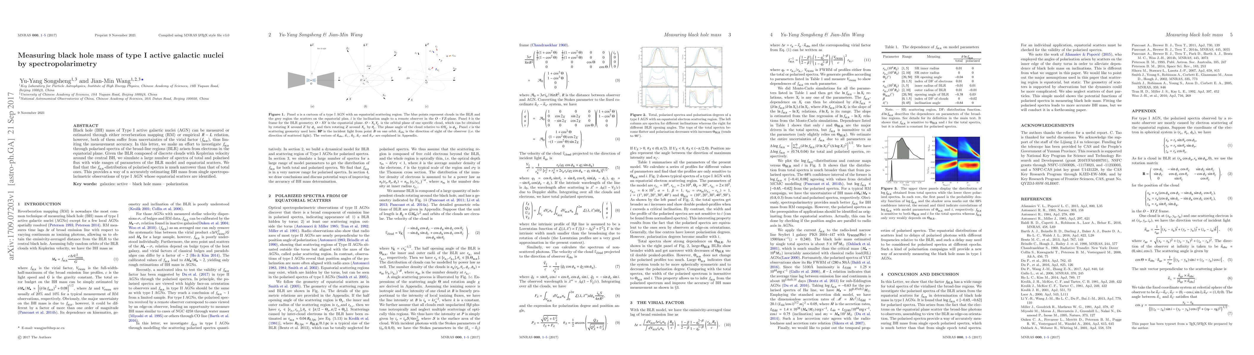 Black hole (BH) mass of Type I active galactic nuclei (AGN) can be measured or estimated through either reverberation mapping (RM) or empirical $R-L$ relation, however, both of them suffer from uncertainties of the virial factor ($f_{\rm BLR}$), thus limiting the measurement accuracy. In this letter, we make an effort to investigate $f_{\rm BLR}$ through polarised spectra of the broad-line regions (BLR) arisen from electrons in the equatorial plane. Given the BLR composed of discrete clouds with Keplerian velocity around the central BH, we simulate a large number of spectra of total and polarised flux with wide ranges of parameters of the BLR model and equatorial scatters. We find that the $f_{\rm BLR}$-distribution of polarised spectra is much narrower than that of total ones. This provides a way of n accurately estimating BH mass from single spectropolarimetric observations of type I AGN whose equatorial scatters are identified.