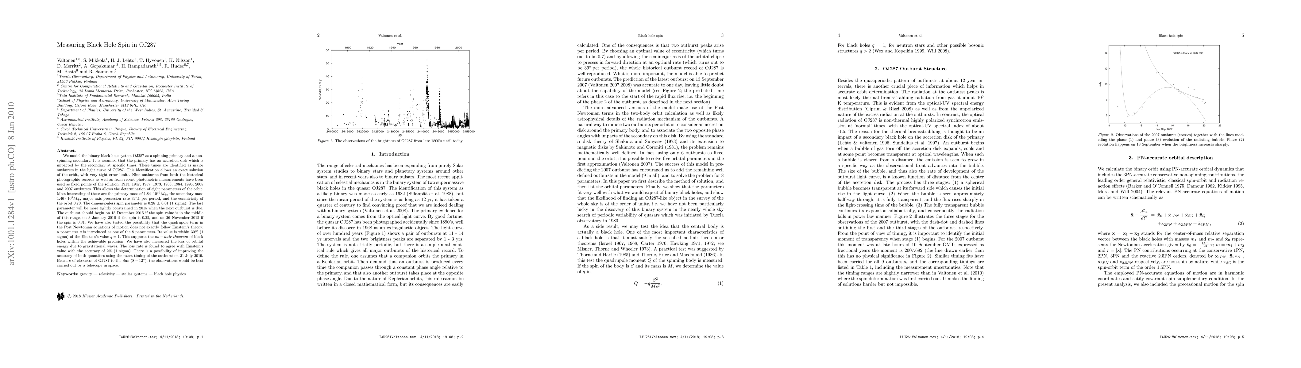We model the binary black hole system OJ287 as a spinning primary and a non-spinning secondary. It is assumed that the primary has an accretion disk which is impacted by the secondary at specific times. These times are identified as major outbursts in the light curve of OJ287. This identification allows an exact solution of the orbit, with very tight error limits. Nine outbursts from both the historical photographic records as well as from recent photometric measurements have been used as fixed points of the solution: 1913, 1947, 1957, 1973, 1983, 1984, 1995, 2005 and 2007 outbursts. This allows the determination of eight parameters of the orbit. Most interesting of these are the primary mass of $1.84\cdot 10^{10} M_\odot$, the secondary mass $1.46\cdot 10^{8} M_\odot$, major axis precession rate $39^\circ.1$ per period, and the eccentricity of the orbit 0.70. The dimensionless spin parameter is $0.28\:\pm\:0.01$ (1 sigma). The last parameter will be more tightly constrained in 2015 when the next outburst is due. The outburst should begin on 15 December 2015 if the spin value is in the middle of this range, on 3 January 2016 if the spin is 0.25, and on 26 November 2015 if the spin is 0.31. We have also tested the possibility that the quadrupole term in the Post Newtonian equations of motion does not exactly follow Einstein's theory: a parameter $q$ is introduced as one of the 8 parameters. Its value is within 30% (1 sigma) of the Einstein's value $q = 1$. This supports the $no-hair theorem$ of black holes within the achievable precision. We have also measured the loss of orbital energy due to gravitational waves. The loss rate is found to agree with Einstein's value with the accuracy of 2% (1 sigma).