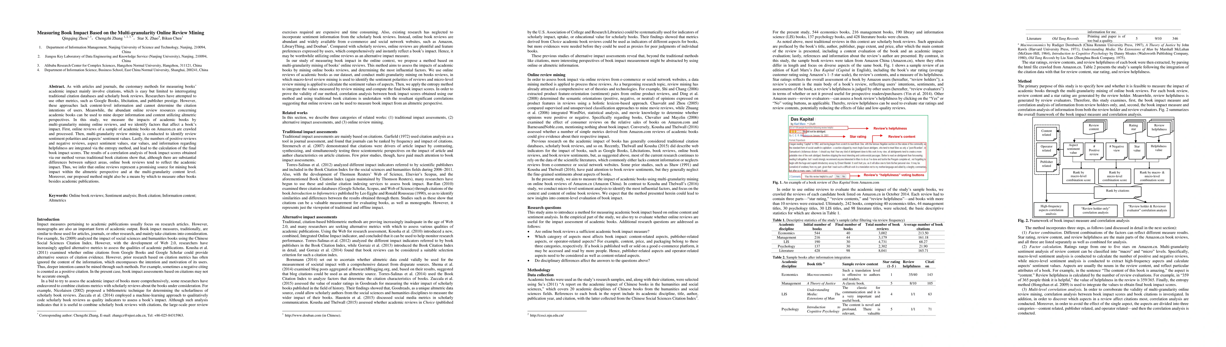 As with articles and journals, the customary methods for measuring books' academic impact mainly involve citations, which is easy but limited to interrogating traditional citation databases and scholarly book reviews, Researchers have attempted to use other metrics, such as Google Books, libcitation, and publisher prestige. However, these approaches lack content-level information and cannot determine the citation intentions of users. Meanwhile, the abundant online review resources concerning academic books can be used to mine deeper information and content utilizing altmetric perspectives. In this study, we measure the impacts of academic books by multi-granularity mining online reviews, and we identify factors that affect a book's impact. First, online reviews of a sample of academic books on Amazon.cn are crawled and processed. Then, multi-granularity review mining is conducted to identify review sentiment polarities and aspects' sentiment values. Lastly, the numbers of positive reviews and negative reviews, aspect sentiment values, star values, and information regarding helpfulness are integrated via the entropy method, and lead to the calculation of the final book impact scores. The results of a correlation analysis of book impact scores obtained via our method versus traditional book citations show that, although there are substantial differences between subject areas, online book reviews tend to reflect the academic impact. Thus, we infer that online reviews represent a promising source for mining book impact within the altmetric perspective and at the multi-granularity content level. Moreover, our proposed method might also be a means by which to measure other books besides academic publications.