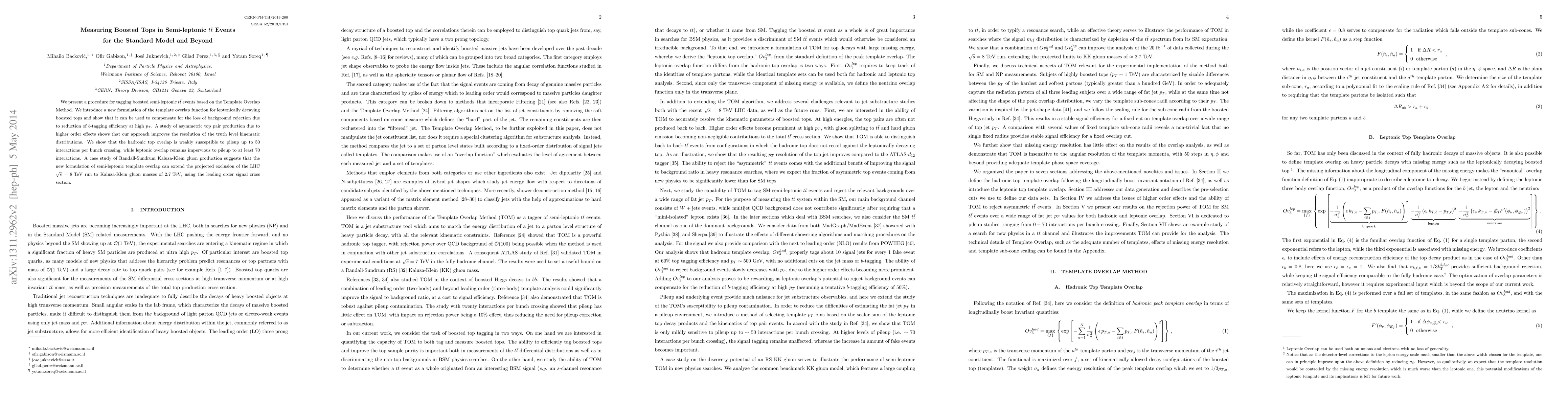 This paper introduces a Template Overlap Method for tagging boosted semi-leptonic top-antitop events, improving background rejection and kinematic resolution, and extends the exclusion limits for Randall-Sundrum Kaluza-Klein gluons up to 2.7 TeV. The method shows resilience to pileup, maintaining efficiency even with high interaction rates.