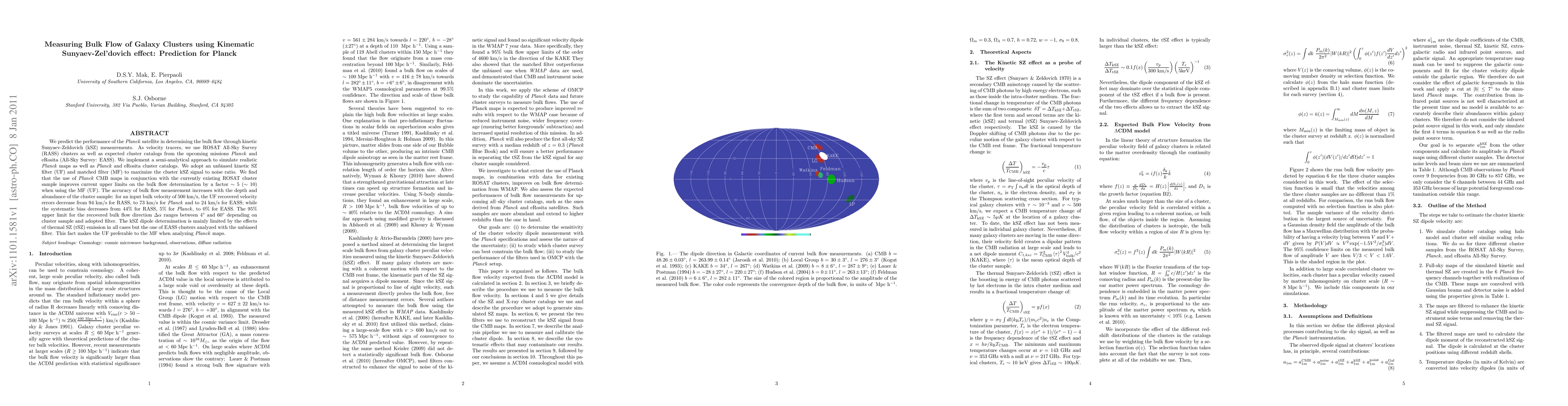 We predict the performance of the Planck satellite in determining the bulk flow through kinetic Sunyaev-Zeldovich (kSZ) measurements. As velocity tracers, we use ROSAT All-Sky Survey (RASS) clusters as well as expected cluster catalogs from the upcoming missions Planck and eRosita (All-Sky Survey: EASS). We implement a semi-analytical approach to simulate realistic Planck maps as well as Planck and eRosita cluster catalogs. We adopt an unbiased kinetic SZ filter (UF) and matched filter (MF) to maximize the cluster kSZ signal to noise ratio. We find that the use of Planck CMB maps in conjunction with the currently existing ROSAT cluster sample improves current upper limits on the bulk flow determination by a factor \sim 5 (\sim 10) when using the MF (UF). The accuracy of bulk flow measurement increases with the depth and abundance of the cluster sample: for an input bulk velocity of 500 km/s, the UF recovered velocity errors decrease from 94 km/s for RASS, to 73 km/s for Planck and to 24 km/s for EASS; while the systematic bias decreases from 44% for RASS, 5% for Planck, to 0% for EASS. The 95% upper limit for the recovered bulk flow direction \Delta {\alpha} ranges between 4 \circ and 60 \circ depending on cluster sample and adopted filter. The kSZ dipole determination is mainly limited by the effects of thermal SZ (tSZ) emission in all cases but the one of EASS clusters analyzed with the unbiased filter. This fact makes the UF preferable to the MF when analyzing Planck maps.