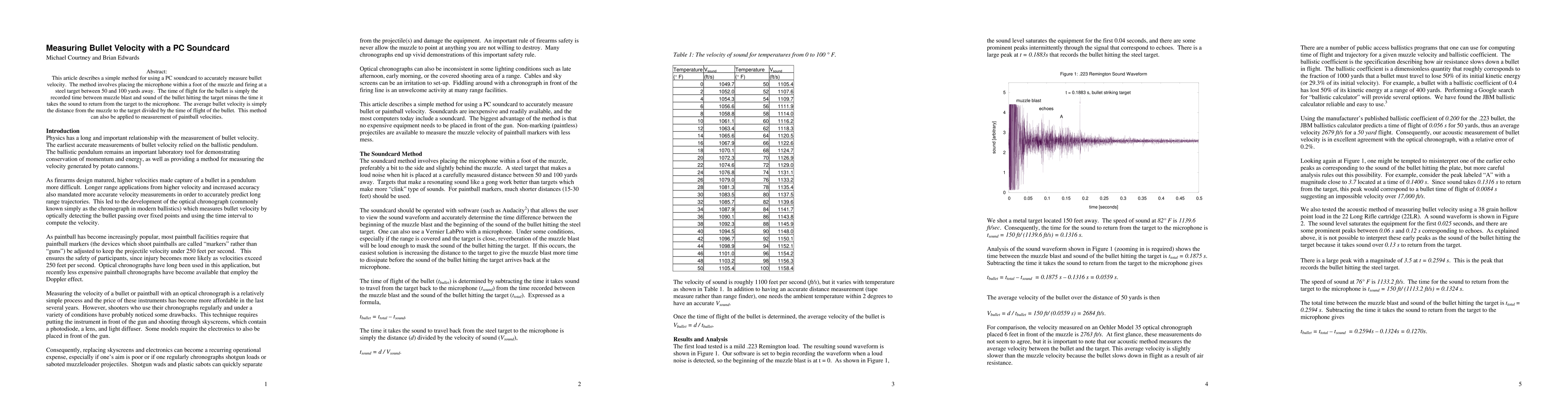This article describes a simple method for using a PC soundcard to accurately measure bullet velocity. The method involves placing the microphone within a foot of the muzzle and firing at a steel target between 50 and 100 yards away. The time of flight for the bullet is simply the recorded time between muzzle blast and sound of the bullet hitting the target minus the time it takes the sound to return from the target to the microphone. The average bullet velocity is simply the distance from the muzzle to the target divided by the time of flight of the bullet. This method can also be applied to measurement of paintball velocities.