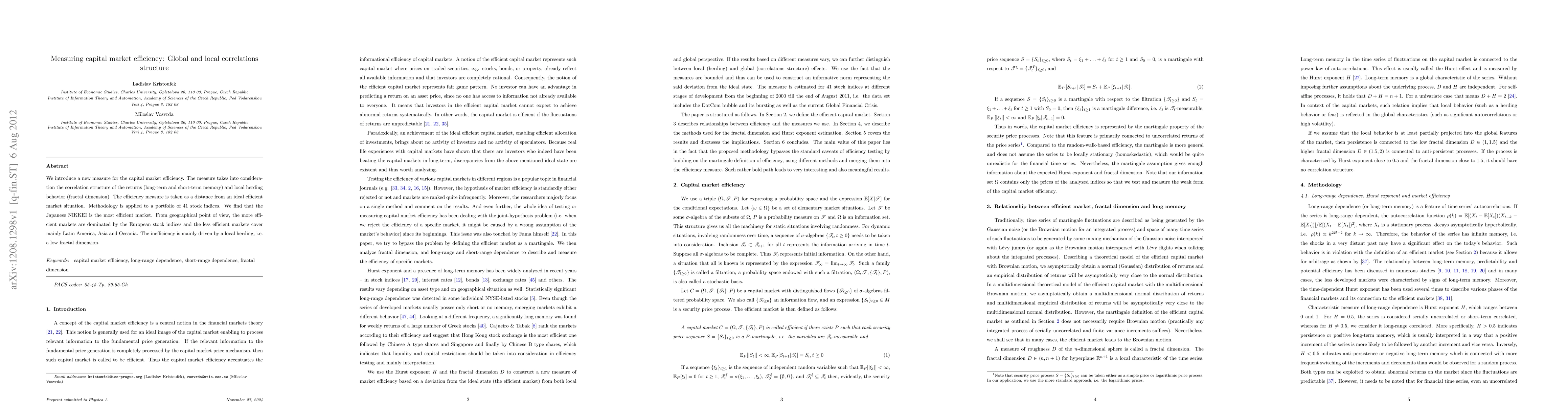 A new measure of capital market efficiency considers correlation structure and local herding behavior, finding Japan's NIKKEI as the most efficient and European indices more efficient globally.