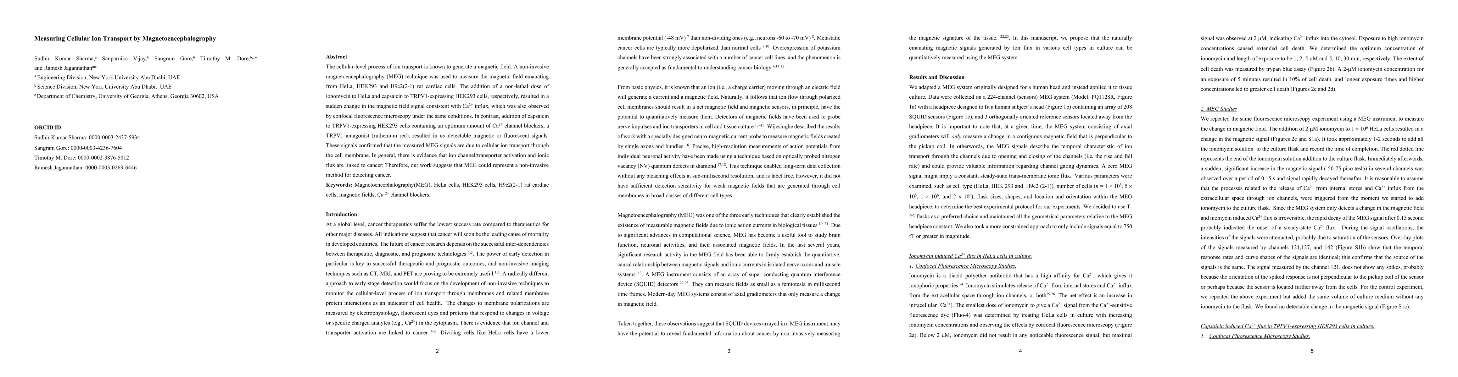 The cellular-level process of ion transport is known to generate a magnetic field. A non-invasive magnetoencephalography (MEG) technique was used to measure the magnetic field emanating from HeLa, HEK293 and H9c2(2-1) rat cardiac cells. The addition of a non-lethal dose of ionomycin to HeLa and capsaicin to TRPV1-expressing HEK293 cells, respectively, resulted in a sudden change in the magnetic field signal consistent with Ca2+ influx, which was also observed by confocal fluorescence microscopy under the same conditions. In contrast, addition of capsaicin to TRPV1-expressing HEK293 cells containing an optimum amount of Ca2+ channel blockers, a TRPV1 antagonist (ruthenium red), resulted in no detectable magnetic or fluorescent signals. These signals confirmed that the measured MEG signals are due to cellular ion transport through the cell membrane. In general, there is evidence that ion channel/transporter activation and ionic flux are linked to cancer; Therefore, our work suggests that MEG could represent a non-invasive method for detecting cancer.