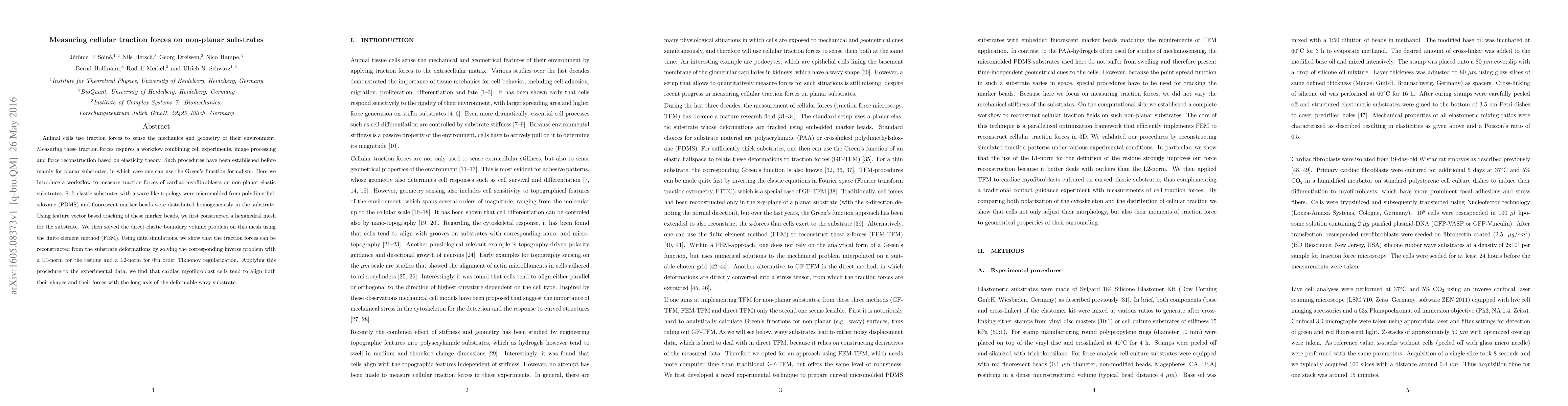 This paper introduces a new workflow to measure cellular traction forces exerted by cardiac myofibroblasts on non-planar elastic substrates, using micromolded PDMS substrates with wave-like topology and fluorescent marker beads. The method combines image processing, finite element modeling, and inverse problem solving to reconstruct traction forces.