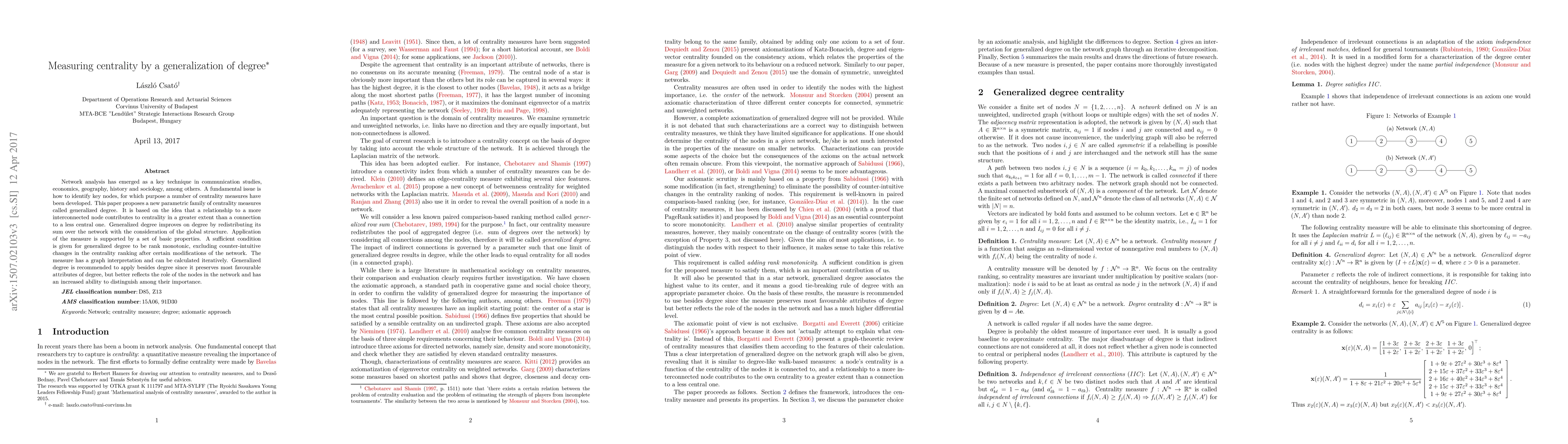 This paper introduces a new centrality measure called generalized degree, which enhances traditional degree centrality by considering the global network structure and the centrality of connected nodes. It preserves favorable properties of degree centrality while better reflecting node importance and maintaining rank monotonicity.