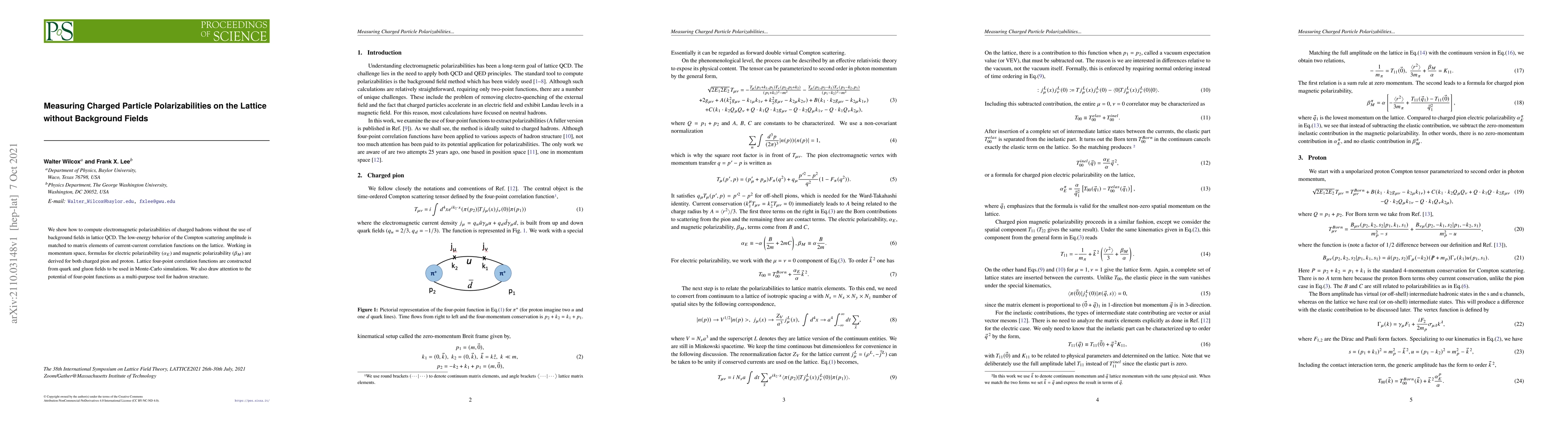 We show how to compute electromagnetic polarizabilities of charged hadrons without the use of background fields in lattice QCD. The low-energy behavior of the Compton scattering amplitude is matched to matrix elements of current-current correlation functions on the lattice. Working in momentum space, formulas for electric polarizability ($\alpha_E$) and magnetic polarizability ($\beta_M$) are derived for both charged pion and proton. Lattice four-point correlation functions are constructed from quark and gluon fields to be used in Monte-Carlo simulations. We also draw attention to the potential of four-point functions as a multi-purpose tool for hadron structure.