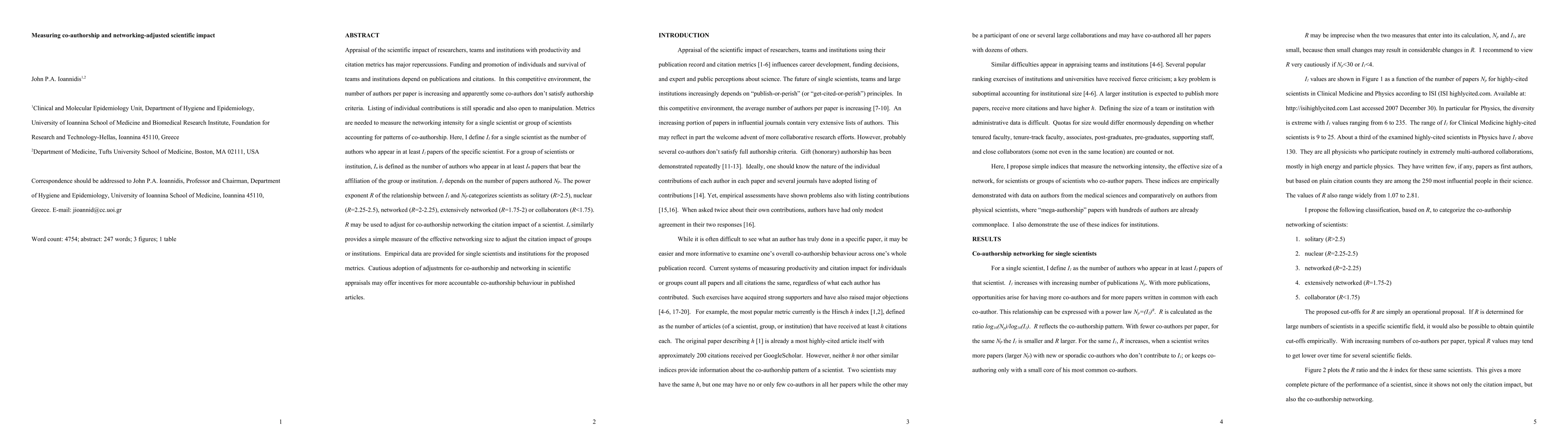 This paper proposes new metrics to measure scientific impact while adjusting for co-authorship and networking patterns. It defines I1 and In to quantify the networking intensity of individual scientists and groups, respectively, and categorizes scientists based on the power exponent R of their relationship between networking intensity and productivity. The proposed adjustments aim to promote more accountable co-authorship practices.