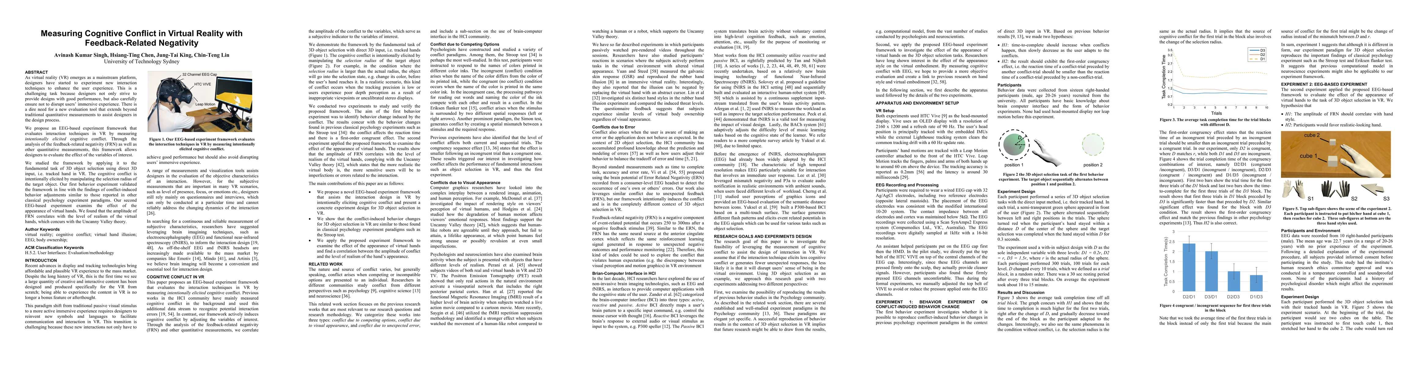 As virtual reality (VR) emerges as a mainstream platform, designers have started to experiment new interaction techniques to enhance the user experience. This is a challenging task because designers not only strive to provide designs with good performance but also carefully ensure not to disrupt users' immersive experience. There is a dire need for a new evaluation tool that extends beyond traditional quantitative measurements to assist designers in the design process. We propose an EEG-based experiment framework that evaluates interaction techniques in VR by measuring intentionally elicited cognitive conflict. Through the analysis of the feedback-related negativity (FRN) as well as other quantitative measurements, this framework allows designers to evaluate the effect of the variables of interest. We studied the framework by applying it to the fundamental task of 3D object selection using direct 3D input, i.e. tracked hand in VR. The cognitive conflict is intentionally elicited by manipulating the selection radius of the target object. Our first behavior experiment validated the framework in line with the findings of conflict-induced behavior adjustments like those reported in other classical psychology experiment paradigms. Our second EEG-based experiment examines the effect of the appearance of virtual hands. We found that the amplitude of FRN correlates with the level of realism of the virtual hands, which concurs with the Uncanny Valley theory.