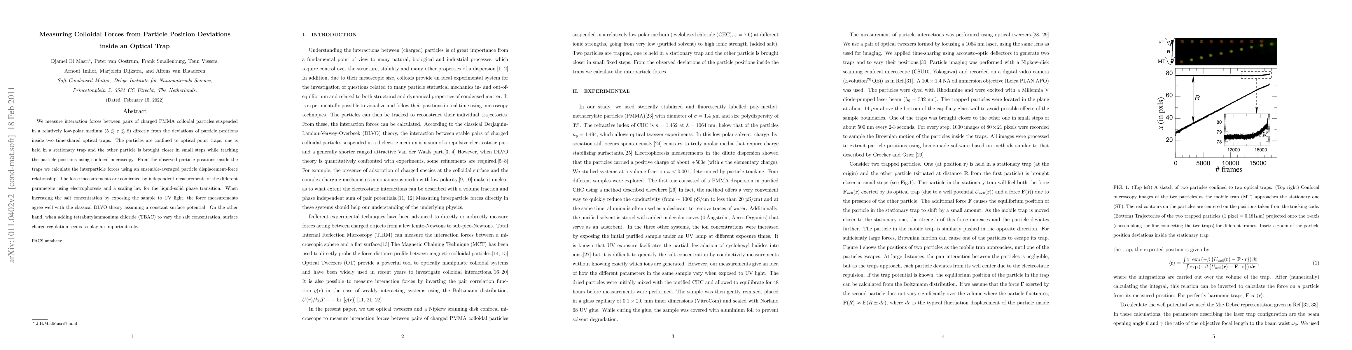 We measure interaction forces between pairs of charged PMMA colloidal particles suspended in a relatively low-polar medium (5 $\lesssim \epsilon \lesssim$ 8) directly from the deviations of particle positions inside two time-shared optical traps. The particles are confined to optical point traps; one is held in a stationary trap and the other particle is brought closer in small steps while tracking the particle positions using confocal microscopy. From the observed particle positions inside the traps we calculate the interparticle forces using an ensemble-averaged particle displacement-force relationship. The force measurements are confirmed by independent measurements of the different parameters using electrophoresis and a scaling law for the liquid-solid phase transition. When increasing the salt concentration by exposing the sample to UV light, the force measurements agree well with the classical DLVO theory assuming a constant surface potential. On the other hand, when adding tetrabutylammonium chloride (TBAC) to vary the salt concentration, surface charge regulation seems to play an important role.