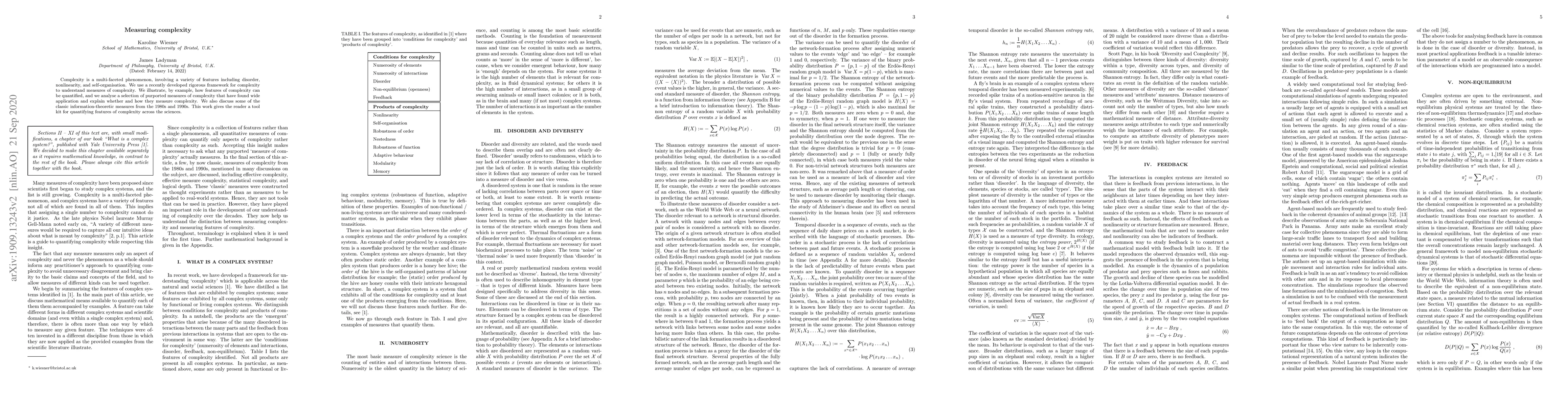 Complexity is a multi-faceted phenomenon, involving a variety of features including disorder, nonlinearity, and self-organisation. We use a recently developed rigorous framework for complexity to understand measures of complexity. We illustrate, by example, how features of complexity can be quantified, and we analyse a selection of purported measures of complexity that have found wide application and explain whether and how they measure complexity. We also discuss some of the classic information-theoretic measures from the 1980s and 1990s. This work gives the reader a tool kit for quantifying features of complexity across the sciences.