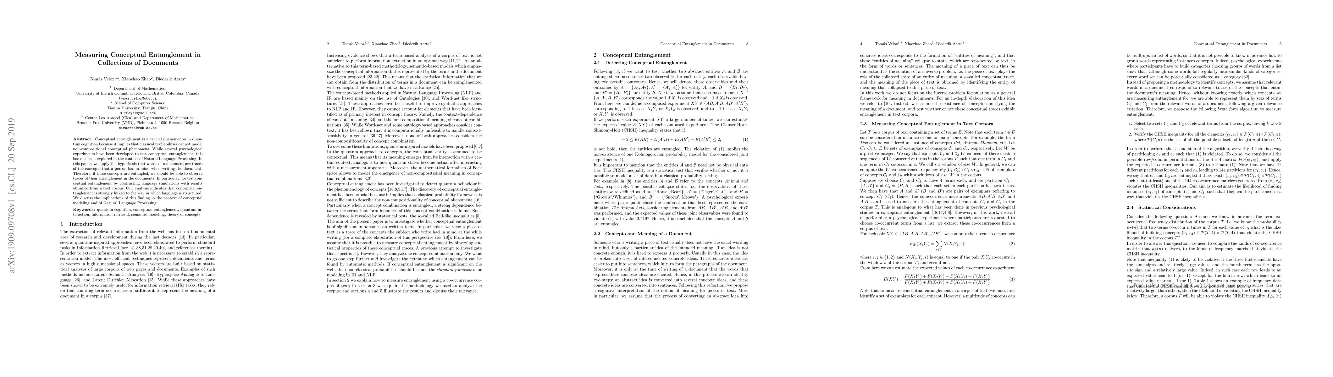 Conceptual entanglement is a crucial phenomenon in quantum cognition because it implies that classical probabilities cannot model non--compositional conceptual phenomena. While several psychological experiments have been developed to test conceptual entanglement, this has not been explored in the context of Natural Language Processing. In this paper, we apply the hypothesis that words of a document are traces of the concepts that a person has in mind when writing the document. Therefore, if these concepts are entangled, we should be able to observe traces of their entanglement in the documents. In particular, we test conceptual entanglement by contrasting language simulations with results obtained from a text corpus. Our analysis indicates that conceptual entanglement is strongly linked to the way in which language is structured. We discuss the implications of this finding in the context of conceptual modeling and of Natural Language Processing.