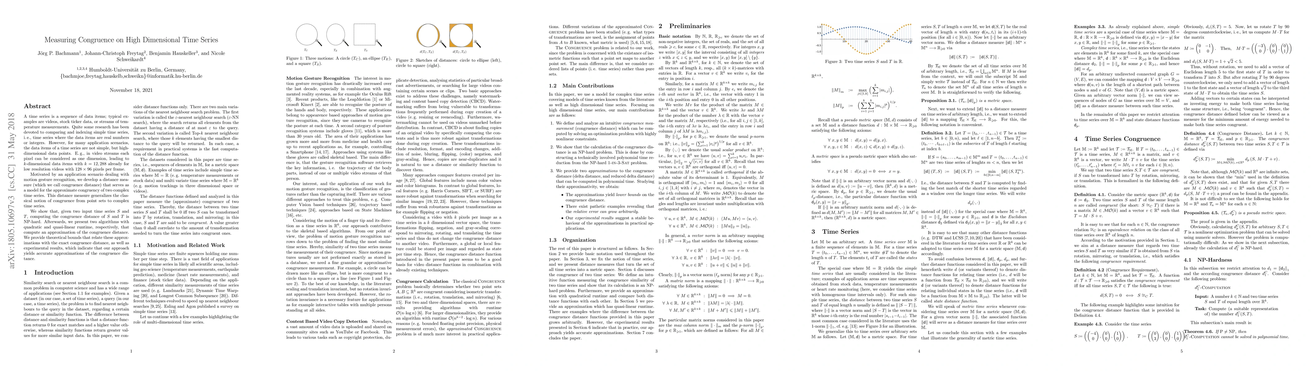 A time series is a sequence of data items; typical examples are videos, stock ticker data, or streams of temperature measurements. Quite some research has been devoted to comparing and indexing simple time series, i.e., time series where the data items are real numbers or integers. However, for many application scenarios, the data items of a time series are not simple, but high-dimensional data points. Motivated by an application scenario dealing with motion gesture recognition, we develop a distance measure (which we call congruence distance) that serves as a model for the approximate congruency of two multi-dimensional time series. This distance measure generalizes the classical notion of congruence from point sets to multi-dimensional time series. We show that, given two input time series $S$ and $T$, computing the congruence distance of $S$ and $T$ is NP-hard. Afterwards, we present two algorithms that compute an approximation of the congruence distance. We provide theoretical bounds that relate these approximations with the exact congruence distance.