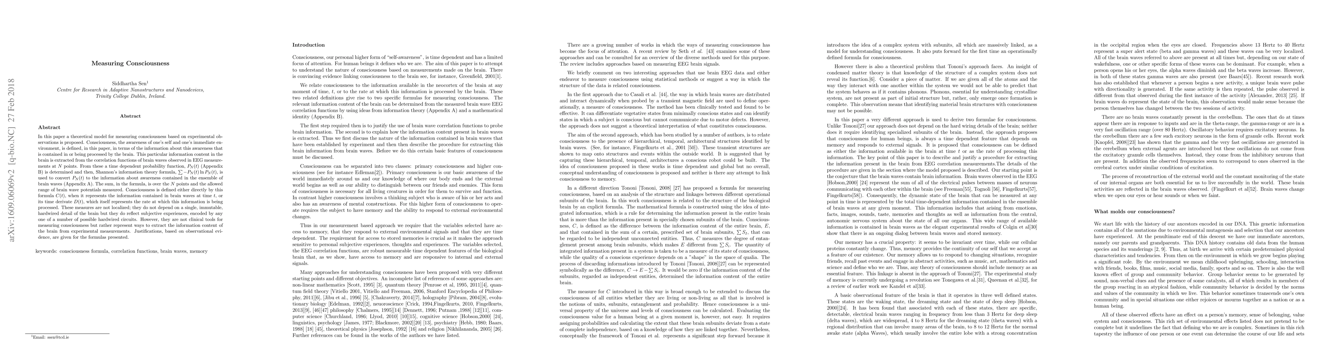 A measurement-based formula measures consciousness as a function of brain wave information content, reflecting awareness in humans, with non-living entities having C=0.