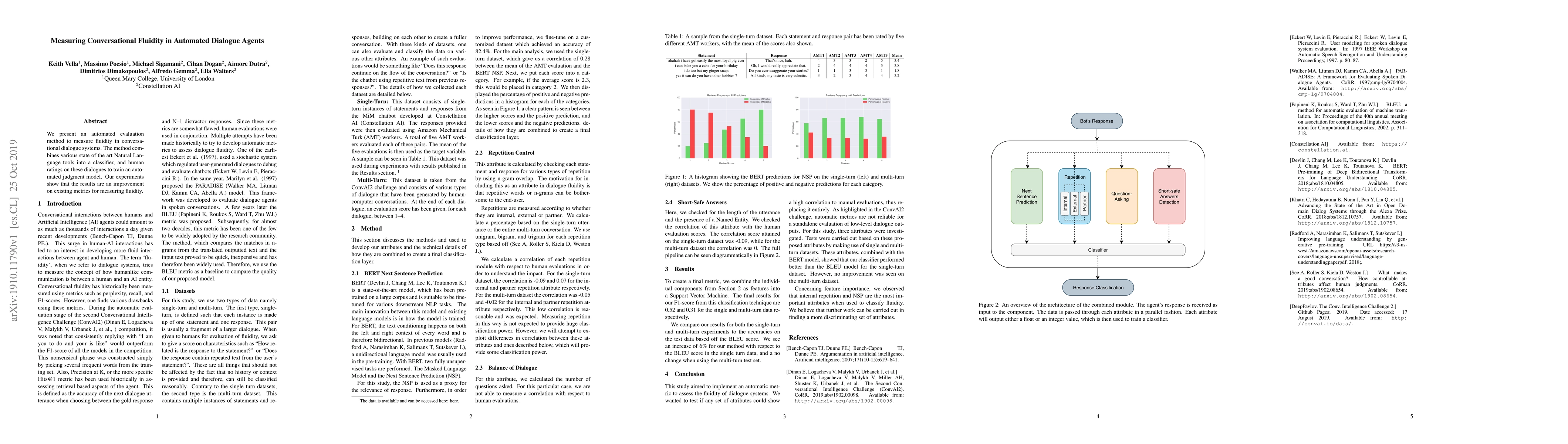 We present an automated evaluation method to measure fluidity in conversational dialogue systems. The method combines various state of the art Natural Language tools into a classifier, and human ratings on these dialogues to train an automated judgment model. Our experiments show that the results are an improvement on existing metrics for measuring fluidity.