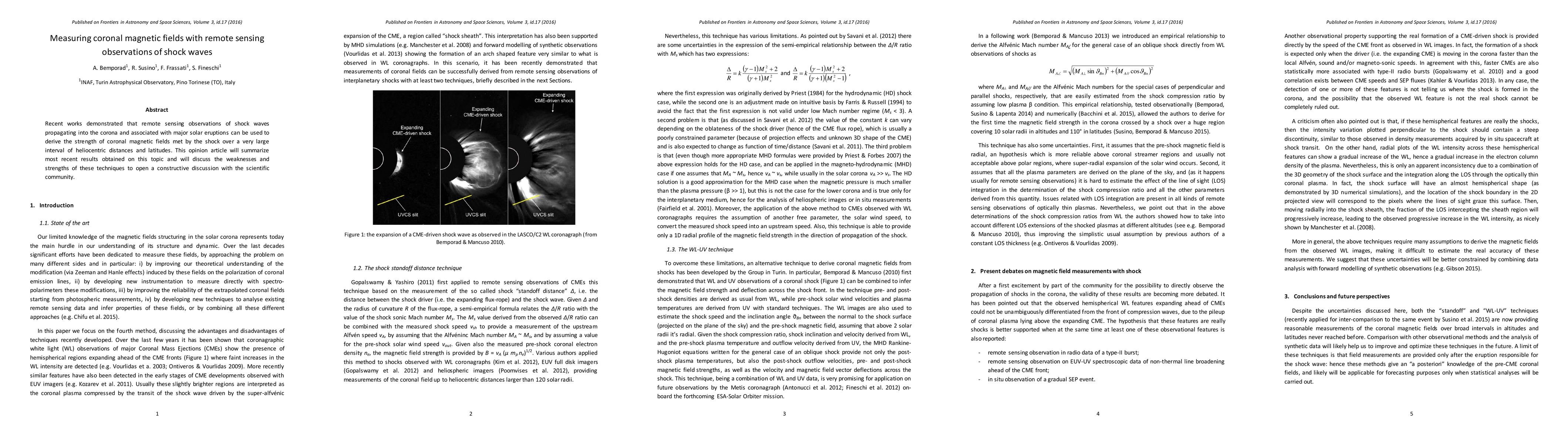 This paper reviews recent advancements in using remote sensing of coronal shock waves to measure magnetic fields in the solar corona, highlighting both the strengths and limitations of these techniques to foster further scientific dialogue.