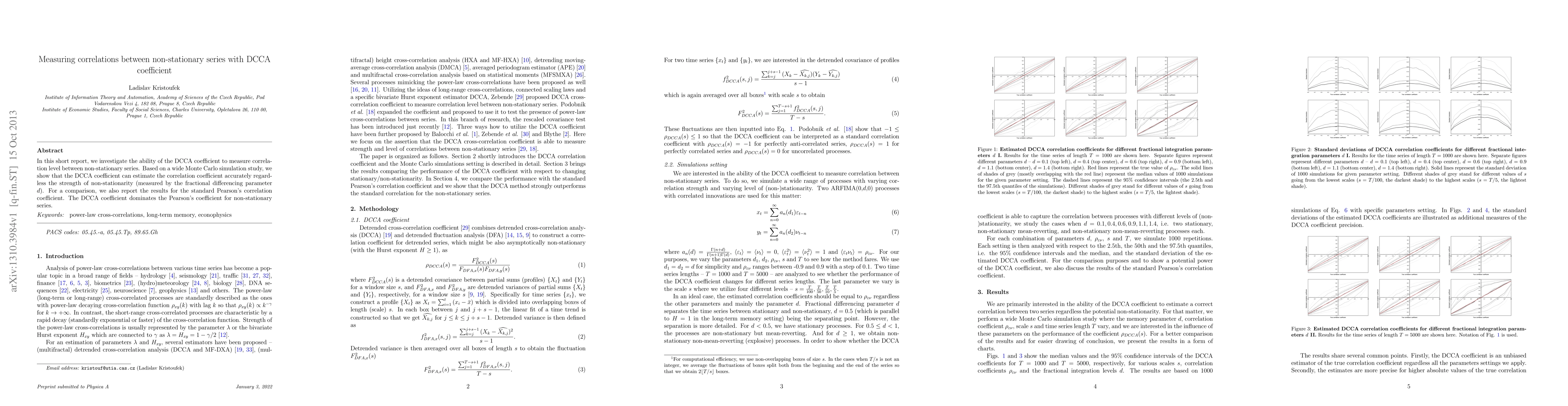 The research employs a Monte Carlo simulation study to evaluate the DCCA coefficient's performance in measuring correlation between non-stationary series, varying parameters such as memory (d), correlation coefficient (ρεν), scales (s), and time series length (T).