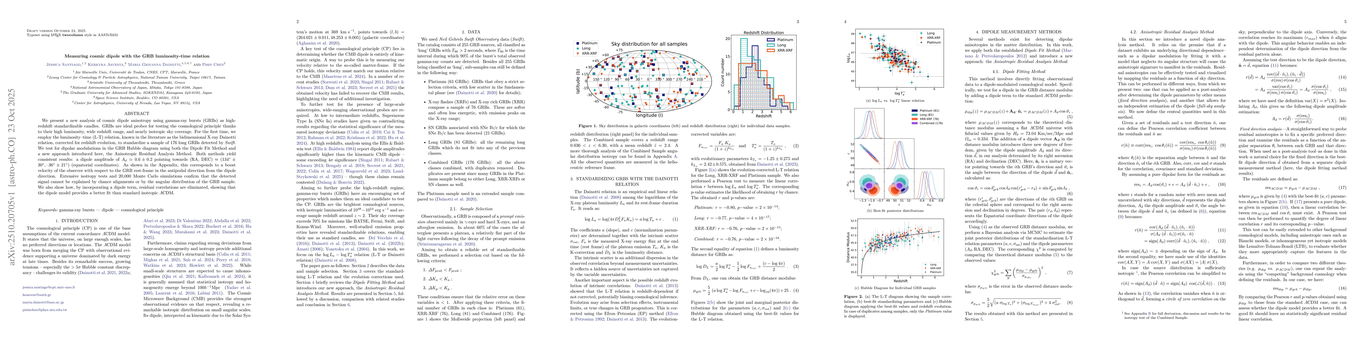We present a new analysis of cosmic dipole anisotropy using gamma-ray bursts (GRBs) as high-redshift standardizable candles. GRBs are ideal probes for testing the cosmological principle thanks to their high luminosity, wide redshift range, and nearly isotropic sky coverage. For the first time, we employ the luminosity-time (L-T) relation, known in the literature as the bidimensional X-ray Dainotti relation, corrected for redshift evolution, to standardize a sample of 176 long GRBs detected by \textit{Swift}. We test for dipolar modulations in the GRB Hubble diagram using both the Dipole Fit Method and a new approach introduced here, the Anisotropic Residual Analysis Method. Both methods yield consistent results: a dipole amplitude of $A_d \simeq 0.6 \pm 0.2$ pointing towards (RA, DEC) $\approx (134^\circ \pm 30^{\circ}, -36^\circ \pm 21^{\circ})$ (equatorial coordinates). As shown in the Appendix, this corresponds to a boost velocity of the observer with respect to the GRB rest-frame in the antipodal direction from the dipole direction. Extensive isotropy tests and 20,000 Monte Carlo simulations confirm that the detected signal cannot be explained by chance alignments or by the angular distribution of the GRB sample. We also show how, by incorporating a dipole term, residual correlations are eliminated, showing that the dipole model provides a better fit than standard isotropic $\Lambda$CDM.