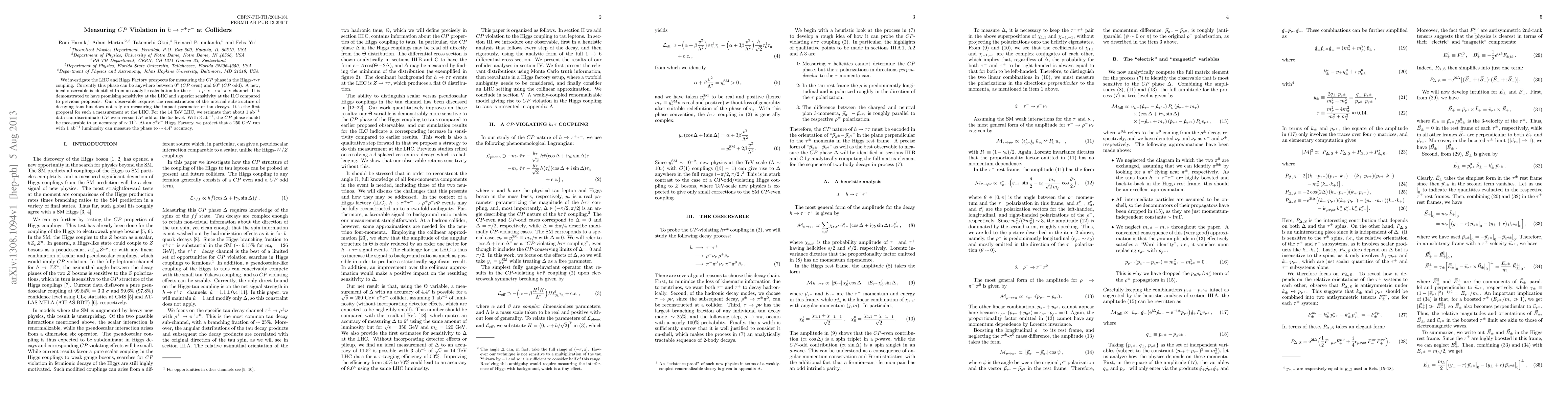 We investigate the LHC and Higgs Factory prospects for measuring the CP phase in the Higgs-tau-tau coupling. Currently this phase can be anywhere between 0 degrees (CP even) and 90 degrees (CP odd). A new, ideal observable is identified from an analytic calculation for the $\tau^\pm \to \rho^\pm\nu \to \pi^\pm \pi^0 \nu$ channel. It is demonstrated to have promising sensitivity at the LHC and superior sensitivity at the ILC compared to previous proposals. Our observable requires the reconstruction of the internal substructure of decaying taus but does not rely on measuring the impact parameter of tau decays. It is the first proposal for such a measurement at the LHC. For the 14 TeV LHC, we estimate that about 1 ab$^{-1}$ data can discriminate CP-even versus CP-odd at the $5\sigma$ level. With 3 ab$^{-1}$, the CP phase should be measurable to an accuracy of $\sim 11$ degrees. At an $e^+e^-$ Higgs Factory, we project that a 250 GeV run with 1 ab$^{-1}$ luminosity can measure the phase to $\sim 4.4$ degrees accuracy.