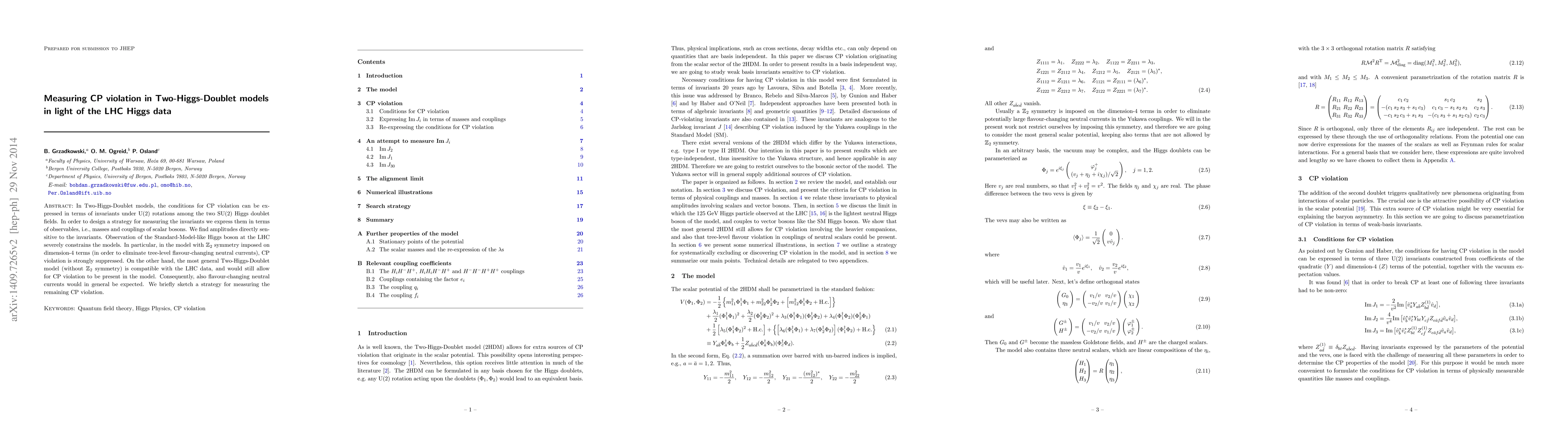 In Two-Higgs-Doublet models, the conditions for CP violation can be expressed in terms of invariants under U(2) rotations among the two SU(2) Higgs doublet fields. In order to design a strategy for measuring the invariants we express them in terms of observables, i.e., masses and couplings of scalar bosons. We find amplitudes directly sensitive to the invariants. Observation of the Standard-Model-like Higgs boson at the LHC severely constrains the models. In particular, in the model with Z_2 symmetry imposed on dimension-4 terms (in order to eliminate tree-level flavour-changing neutral currents), CP violation is strongly suppressed. On the other hand, the most general Two-Higgs-Doublet model (without Z_2 symmetry) would still allow for CP violation to be present in the model, without being in conflict with the LHC data. Consequently, also flavour-changing neutral currents would in general be expected. We briefly sketch a strategy for measuring the remaining CP violation.