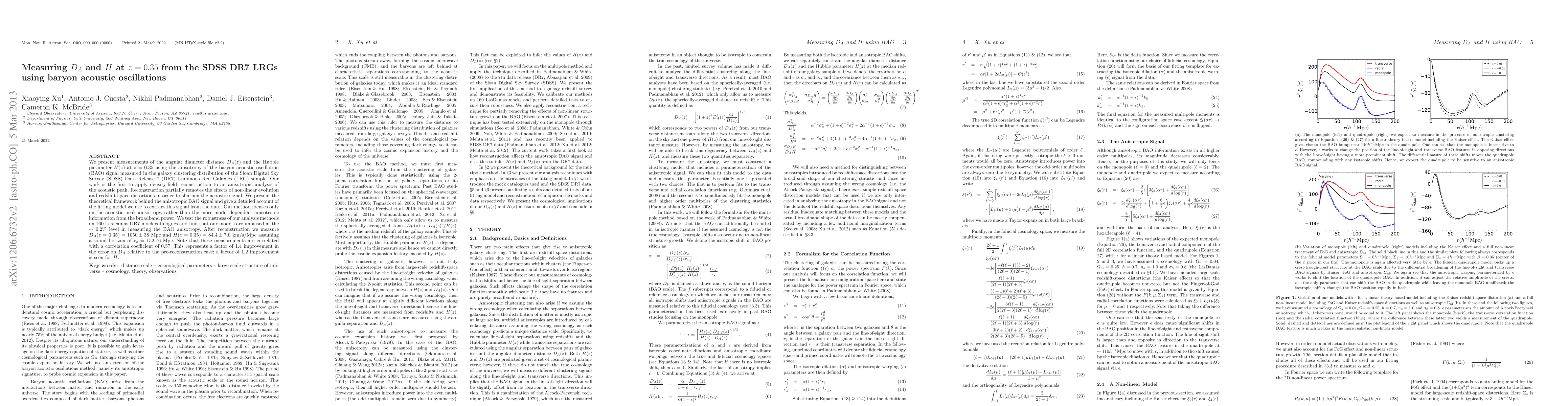 Researchers measured the angular diameter distance D_A(z) and Hubble parameter H(z) at z=0.35 using baryon acoustic oscillations from SDSS DR7 LRGs, achieving a 1.4-fold improvement in error for D_A and 1.2-fold for H compared to pre-reconstruction estimates.