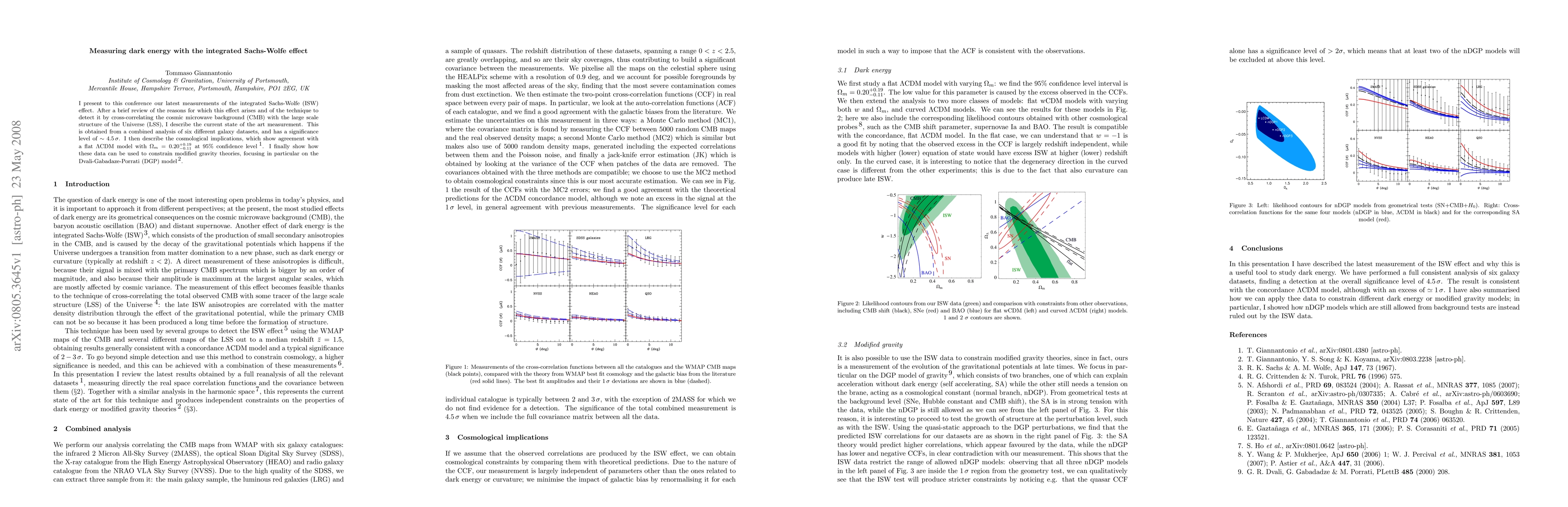 I present to this conference our latest measurements of the integrated Sachs-Wolfe (ISW) effect. After a brief review of the reasons for which this effect arises and of the technique to detect it by cross-correlating the cosmic microwave background (CMB) with the large scale structure of the Universe (LSS), I describe the current state of the art measurement. This is obtained from a combined analysis of six different galaxy datasets, and has a significance level of ~ 4.5 sigma. I then describe the cosmological implications, which show agreement with a flat LCDM model with Omega_m = 0.20 +0.19 -0.11 at 95% confidence level. I finally show how these data can be used to constrain modified gravity theories, focusing in particular on the Dvali-Gabadaze-Porrati (DGP) model.