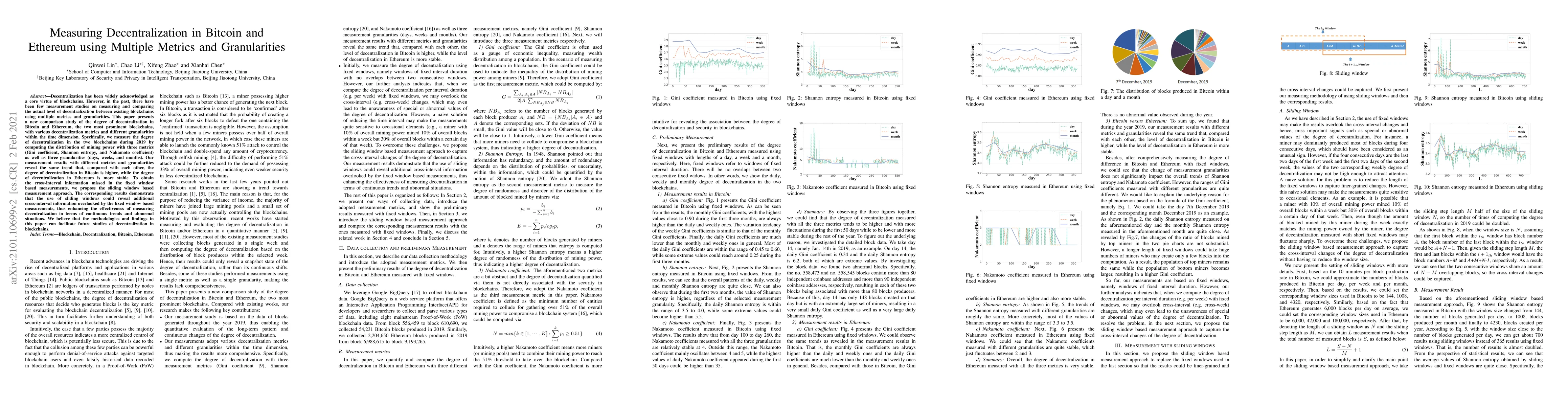 This paper measures and compares decentralization levels in Bitcoin and Ethereum using multiple metrics and granularities, finding that Bitcoin exhibits higher decentralization while Ethereum shows more stability. It introduces a sliding window approach to capture continuous trends and anomalies, enhancing decentralization measurement.