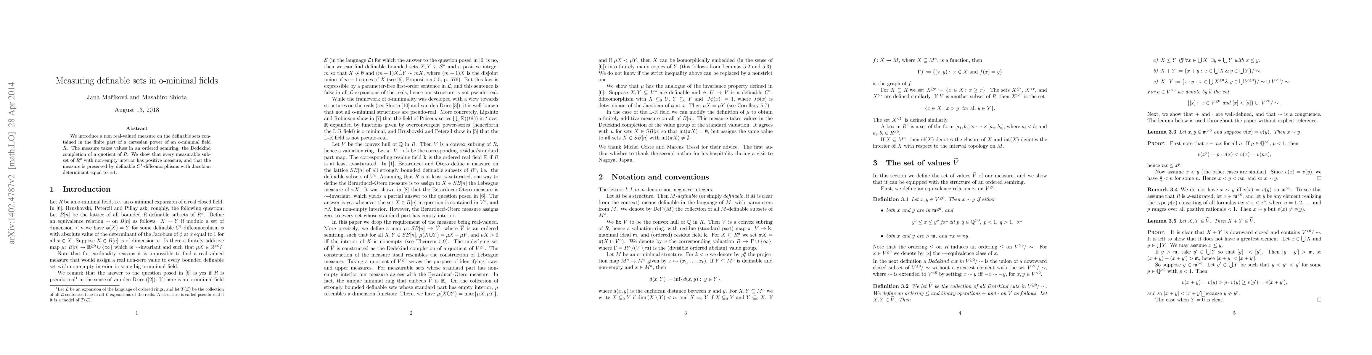 We introduce a non real-valued measure on the definable sets contained in the finite part of a cartesian power of an o-minimal field $R$. The measure takes values in an ordered semiring, the Dedekind completion of a quotient of $R$. We show that every measurable subset of $R^n$ with non-empty interior has positive measure, and that the measure is preserved by definable $C^1$-diffeomorphisms with Jacobian determinant equal to $\pm 1$.