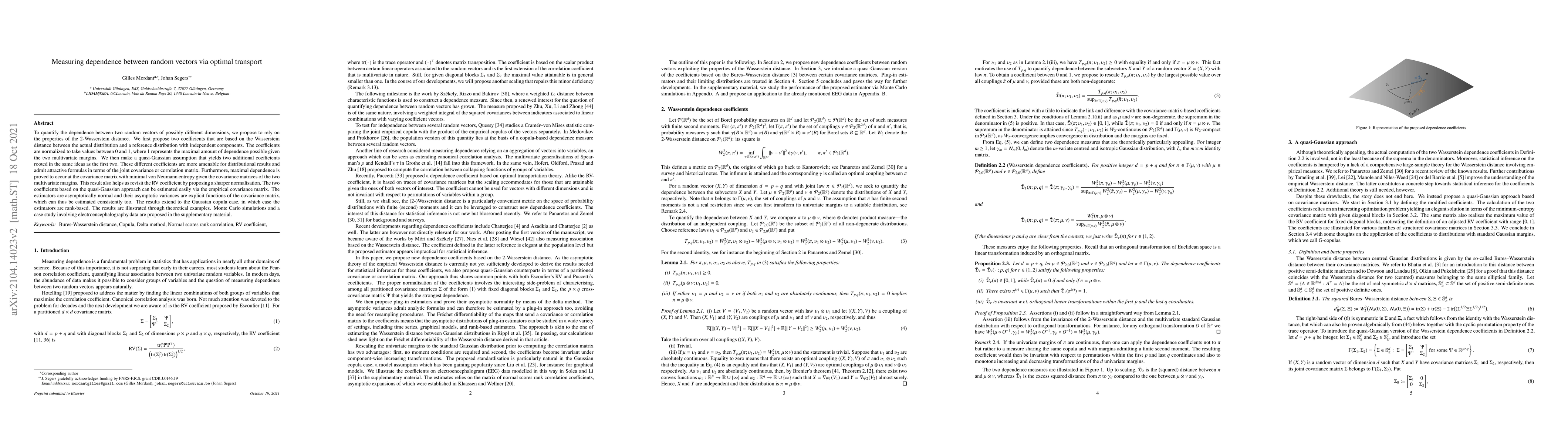This paper proposes new coefficients to measure dependence between two random vectors using the 2-Wasserstein distance, with coefficients normalized to range from 0 to 1. It also introduces quasi-Gaussian assumptions to derive additional coefficients linked to the joint covariance matrix, and proves maximal dependence occurs at the covariance matrix with minimal von Neumann entropy.