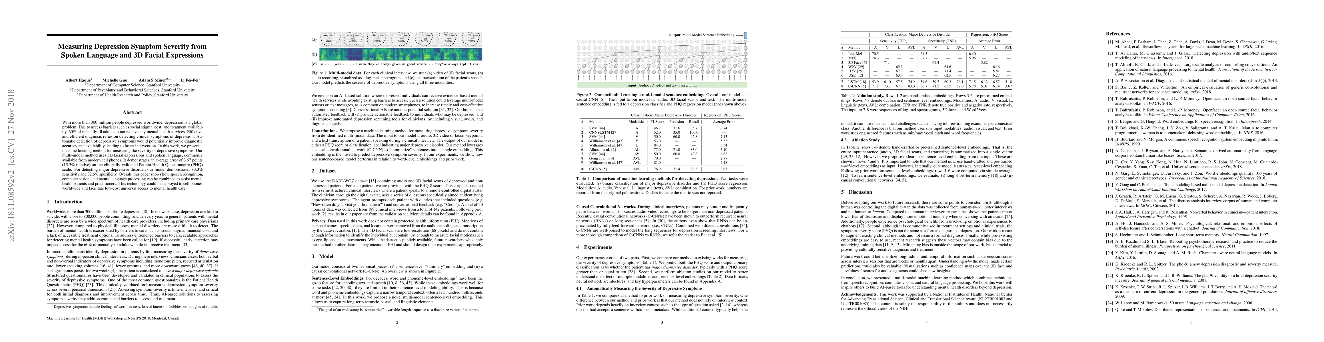 This paper presents a machine learning method combining 3D facial expressions and spoken language to measure depression symptom severity, achieving an average error of 15.3% on the PHQ scale. The model demonstrates high sensitivity and specificity for detecting major depressive disorder, suggesting potential for low-cost, accessible mental health care via cell phones.
