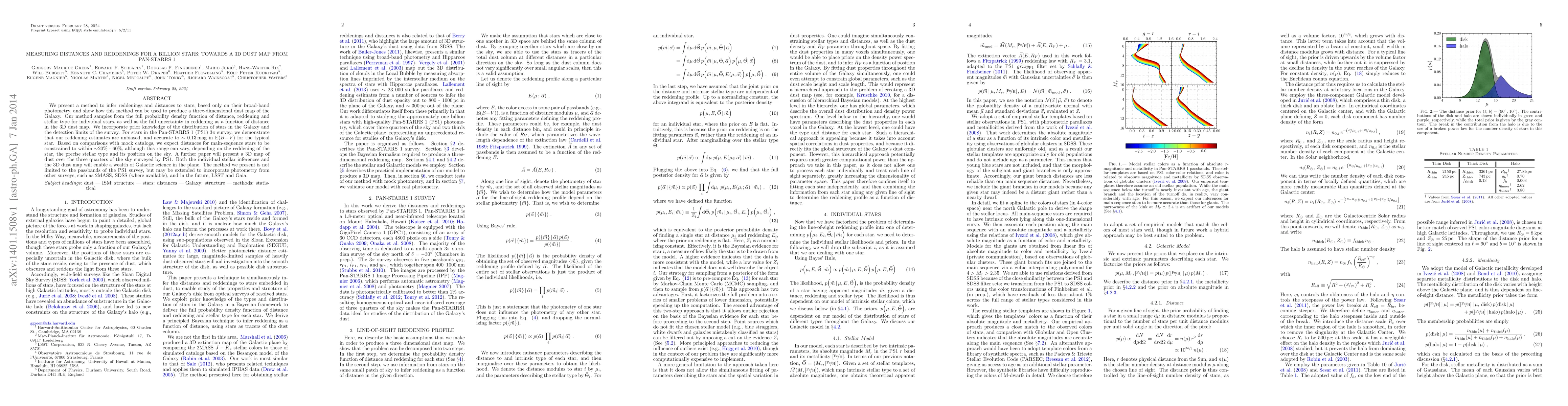 We present a method to infer reddenings and distances to stars, based only on their broad-band photometry, and show how this method can be used to produce a three-dimensional dust map of the Galaxy. Our method samples from the full probability density function of distance, reddening and stellar type for individual stars, as well as the full uncertainty in reddening as a function of distance in the 3D dust map. We incorporate prior knowledge of the distribution of stars in the Galaxy and the detection limits of the survey. For stars in the Pan-STARRS 1 (PS1) 3 pi survey, we demonstrate that our reddening estimates are unbiased, and accurate to ~0.13 mag in E(B-V) for the typical star. Based on comparisons with mock catalogs, we expect distances for main-sequence stars to be constrained to within ~20% - 60%, although this range can vary, depending on the reddening of the star, the precise stellar type and its position on the sky. A further paper will present a 3D map of dust over the three quarters of the sky surveyed by PS1. Both the individual stellar inferences and the 3D dust map will enable a wealth of Galactic science in the plane. The method we present is not limited to the passbands of the PS1 survey, but may be extended to incorporate photometry from other surveys, such as 2MASS, SDSS (where available), and in the future, LSST and Gaia.