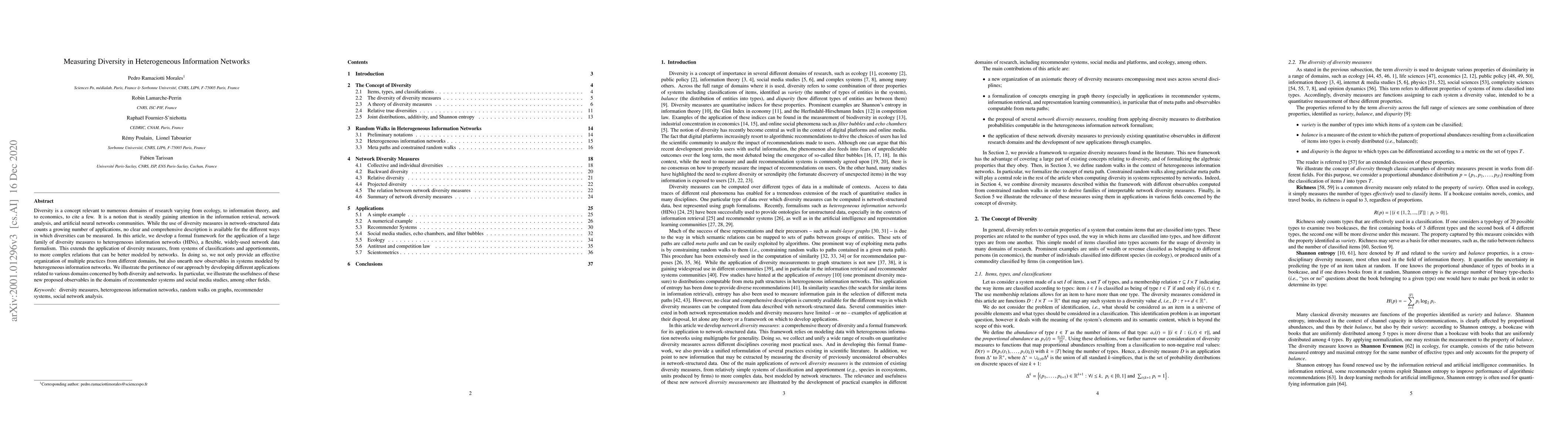 This paper develops a formal framework for measuring diversity in heterogeneous information networks (HINs), offering a comprehensive organization of diverse measures and unveiling new observables. The proposed framework is demonstrated through applications in recommender systems and social media studies, highlighting its utility across various domains.