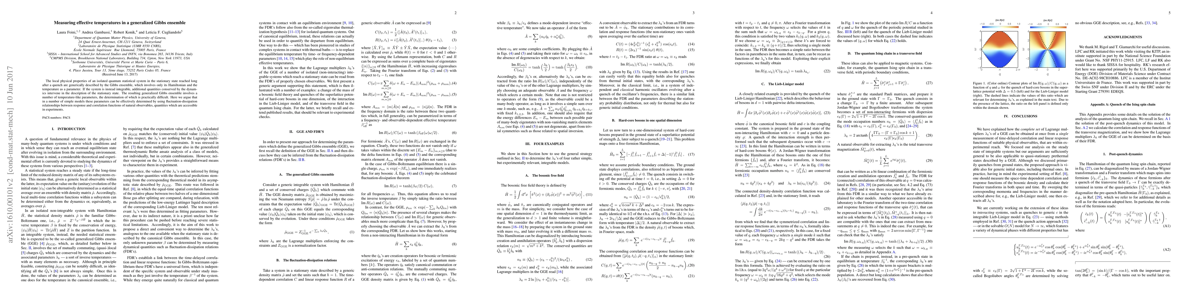 The local physical properties of an isolated quantum statistical system in the stationary state reached long after a quench are generically described by the Gibbs ensemble, which involves only its Hamiltonian and the temperature as a parameter. If the system is instead integrable, additional quantities conserved by the dynamics intervene in the description of the stationary state. The resulting generalized Gibbs ensemble involves a number of temperature-like parameters, the determination of which is practically difficult. Here we argue that in a number of simple models these parameters can be effectively determined by using fluctuation-dissipation relationships between response and correlation functions of natural observables, quantities which are accessible in experiments.