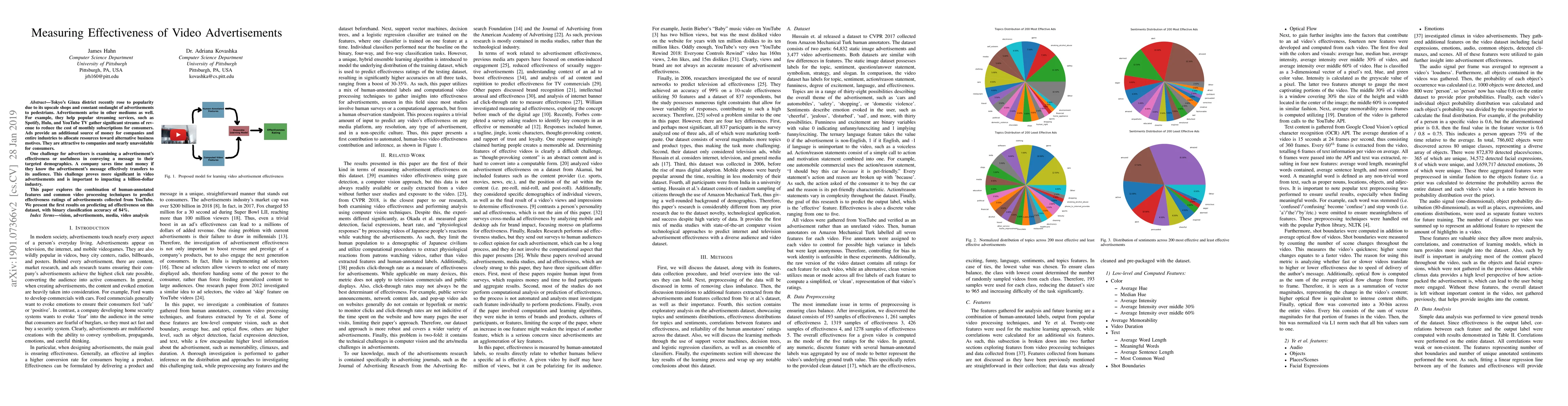 Advertisements are unavoidable in modern society. Times Square is notorious for its incessant display of advertisements. Its popularity is worldwide and smaller cities possess miniature versions of the display, such as Pittsburgh and its digital works in Oakland on Forbes Avenue. Tokyo's Ginza district recently rose to popularity due to its upscale shops and constant onslaught of advertisements to pedestrians. Advertisements arise in other mediums as well. For example, they help popular streaming services, such as Spotify, Hulu, and Youtube TV gather significant streams of revenue to reduce the cost of monthly subscriptions for consumers. Ads provide an additional source of money for companies and entire industries to allocate resources toward alternative business motives. They are attractive to companies and nearly unavoidable for consumers. One challenge for advertisers is examining a advertisement's effectiveness or usefulness in conveying a message to their targeted demographics. Rather than constructing a single, static image of content, a video advertisement possesses hundreds of frames of data with varying scenes, actors, objects, and complexity. Therefore, measuring effectiveness of video advertisements is important to impacting a billion-dollar industry. This paper explores the combination of human-annotated features and common video processing techniques to predict effectiveness ratings of advertisements collected from Youtube. This task is seen as a binary (effective vs. non-effective), four-way, and five-way machine learning classification task. The first findings in terms of accuracy and inference on this dataset, as well as some of the first ad research, on a small dataset are presented. Accuracies of 84\%, 65\%, and 55\% are reached on the binary, four-way, and five-way tasks respectively.