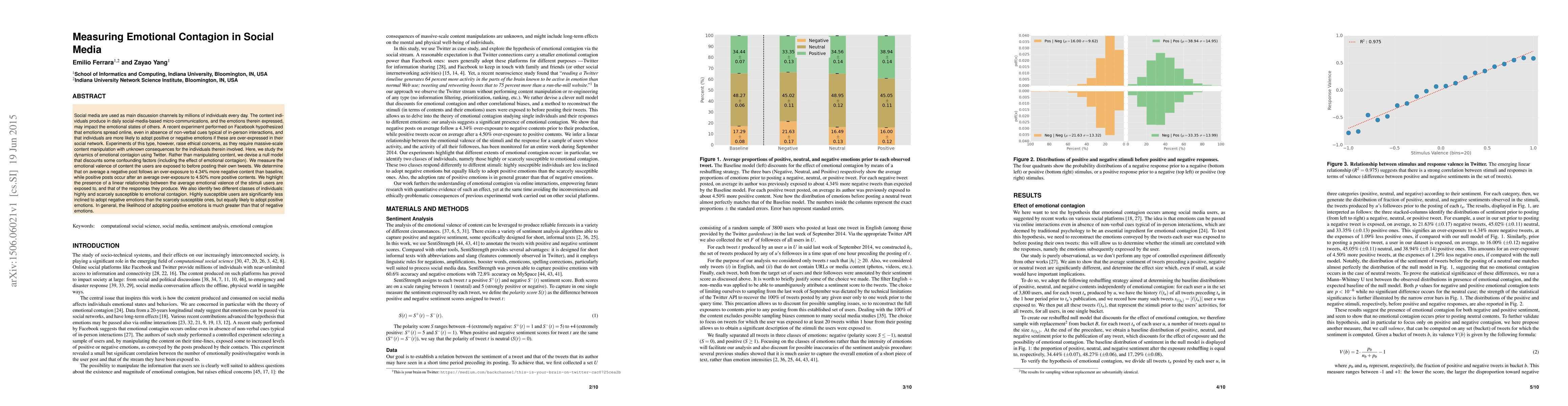 Social media are used as main discussion channels by millions of individuals every day. The content individuals produce in daily social-media-based micro-communications, and the emotions therein expressed, may impact the emotional states of others. A recent experiment performed on Facebook hypothesized that emotions spread online, even in absence of non-verbal cues typical of in-person interactions, and that individuals are more likely to adopt positive or negative emotions if these are over-expressed in their social network. Experiments of this type, however, raise ethical concerns, as they require massive-scale content manipulation with unknown consequences for the individuals therein involved. Here, we study the dynamics of emotional contagion using Twitter. Rather than manipulating content, we devise a null model that discounts some confounding factors (including the effect of emotional contagion). We measure the emotional valence of content the users are exposed to before posting their own tweets. We determine that on average a negative post follows an over-exposure to 4.34% more negative content than baseline, while positive posts occur after an average over-exposure to 4.50% more positive contents. We highlight the presence of a linear relationship between the average emotional valence of the stimuli users are exposed to, and that of the responses they produce. We also identify two different classes of individuals: highly and scarcely susceptible to emotional contagion. Highly susceptible users are significantly less inclined to adopt negative emotions than the scarcely susceptible ones, but equally likely to adopt positive emotions. In general, the likelihood of adopting positive emotions is much greater than that of negative emotions.