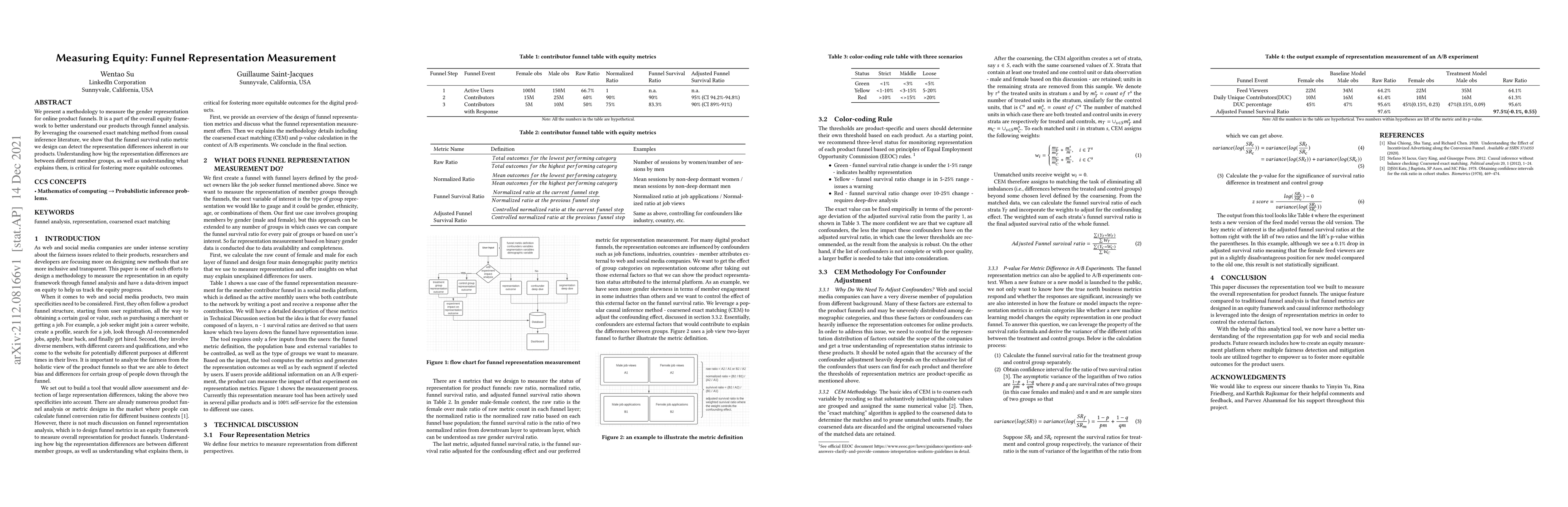 This research paper introduces a methodology to measure gender representation in online product funnels using funnel survival ratio metrics from causal inference literature. It aims to detect representation differences and foster more equitable outcomes.