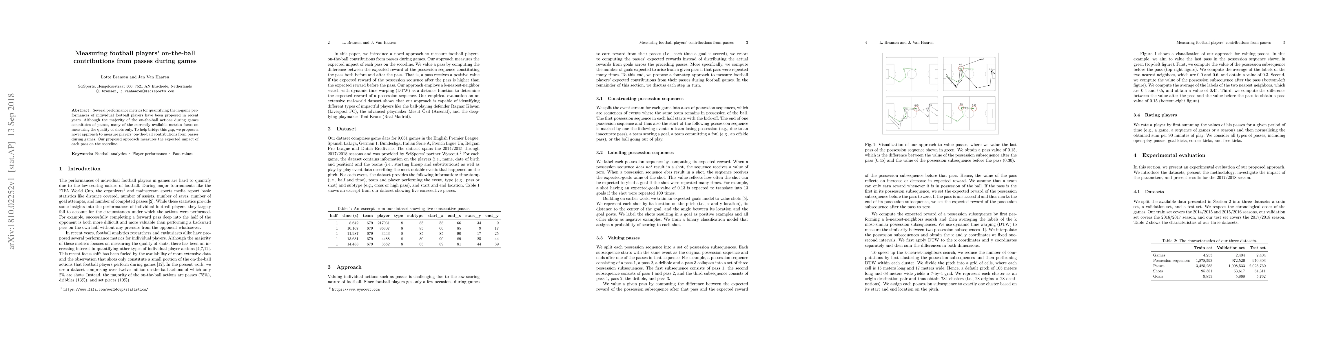 Several performance metrics for quantifying the in-game performances of individual football players have been proposed in recent years. Although the majority of the on-the-ball actions during games constitutes of passes, many of the currently available metrics focus on measuring the quality of shots only. To help bridge this gap, we propose a novel approach to measure players' on-the-ball contributions from passes during games. Our proposed approach measures the expected impact of each pass on the scoreline.