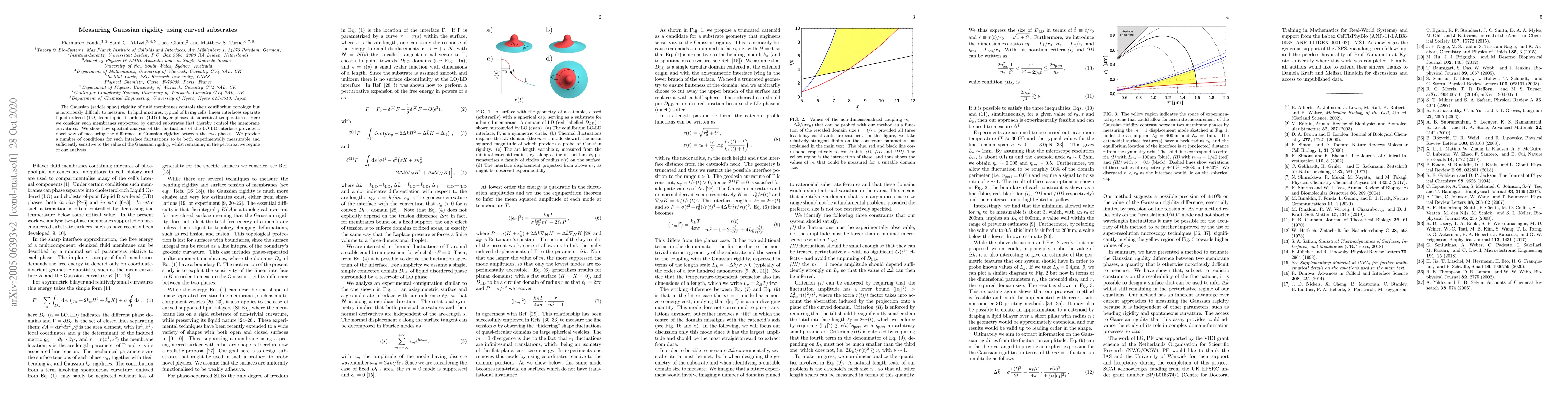 The Gaussian (saddle splay) rigidity of fluid membranes controls their equilibrium topology but is notoriously difficult to measure. In lipid mixtures, typical of living cells, linear interfaces separate liquid ordered (LO) from liquid disordered (LD) bilayer phases at subcritical temperatures. Here we consider such membranes supported by curved supports that thereby control the membrane curvatures. We show how spectral analysis of the fluctuations of the LO-LD interface provides a novel way of measuring the difference in Gaussian rigidity between the two phases. We provide a number of conditions for such interface fluctuations to be both experimentally measurable and sufficiently sensitive to the value of the Gaussian rigidity, whilst remaining in the perturbative regime of our analysis.