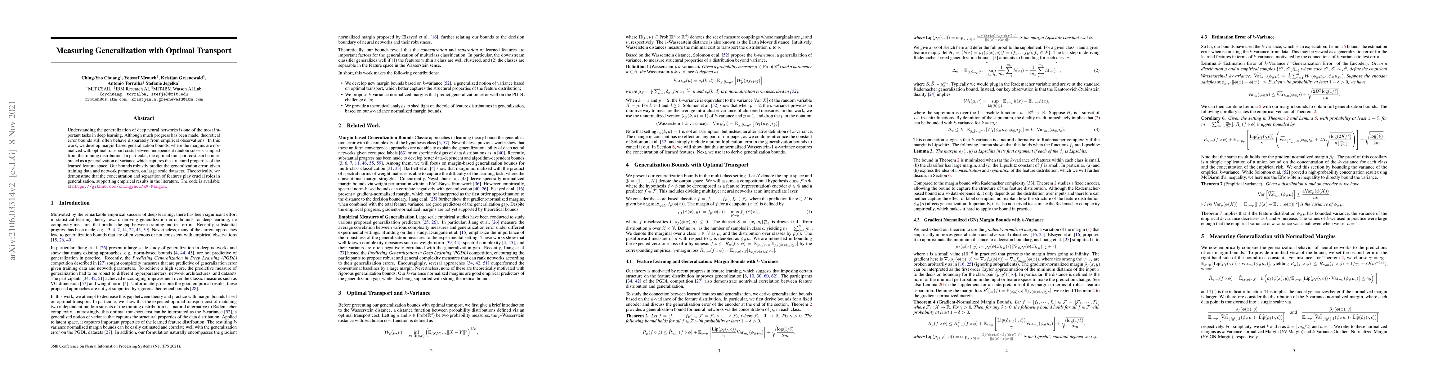 Understanding the generalization of deep neural networks is one of the most important tasks in deep learning. Although much progress has been made, theoretical error bounds still often behave disparately from empirical observations. In this work, we develop margin-based generalization bounds, where the margins are normalized with optimal transport costs between independent random subsets sampled from the training distribution. In particular, the optimal transport cost can be interpreted as a generalization of variance which captures the structural properties of the learned feature space. Our bounds robustly predict the generalization error, given training data and network parameters, on large scale datasets. Theoretically, we demonstrate that the concentration and separation of features play crucial roles in generalization, supporting empirical results in the literature. The code is available at \url{https://github.com/chingyaoc/kV-Margin}.