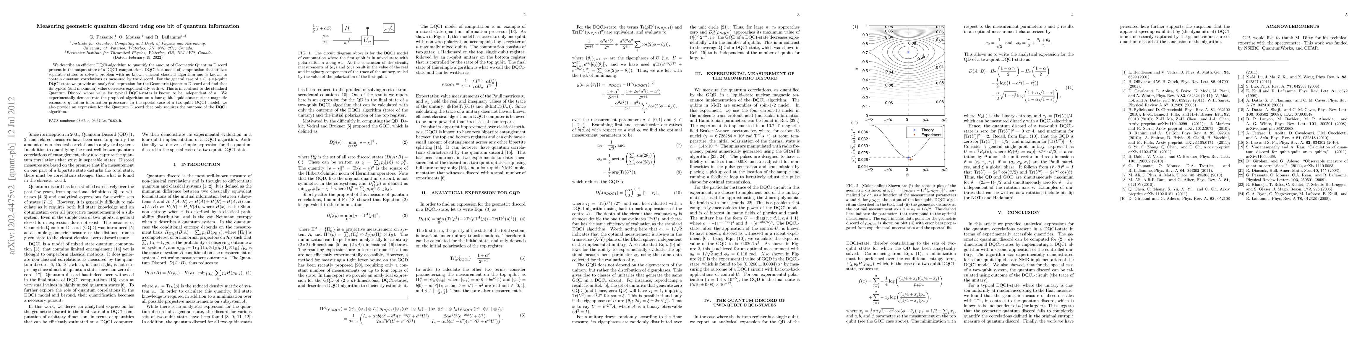 We describe an efficient DQC1-algorithm to quantify the amount of Geometric Quantum Discord present in the output state of a DQC1 computation. DQC1 is a model of computation that utilizes separable states to solve a problem with no known efficient classical algorithm and is known to contain quantum correlations as measured by the discord. For the general case of a (1+n)-qubit DQC1-state we provide an analytical expression for the Geometric Quantum Discord and find that its typical (and maximum) value decreases exponentially with n. This is in contrast to the standard Quantum Discord whose value for typical DQC1-states is known to be independent of n. We experimentally demonstrate the proposed algorithm on a four-qubit liquid-state nuclear magnetic resonance quantum information processor. In the special case of a two-qubit DQC1 model, we also provide an expression for the Quantum Discord that only requires the outcome of the DQC1 algorithm.
