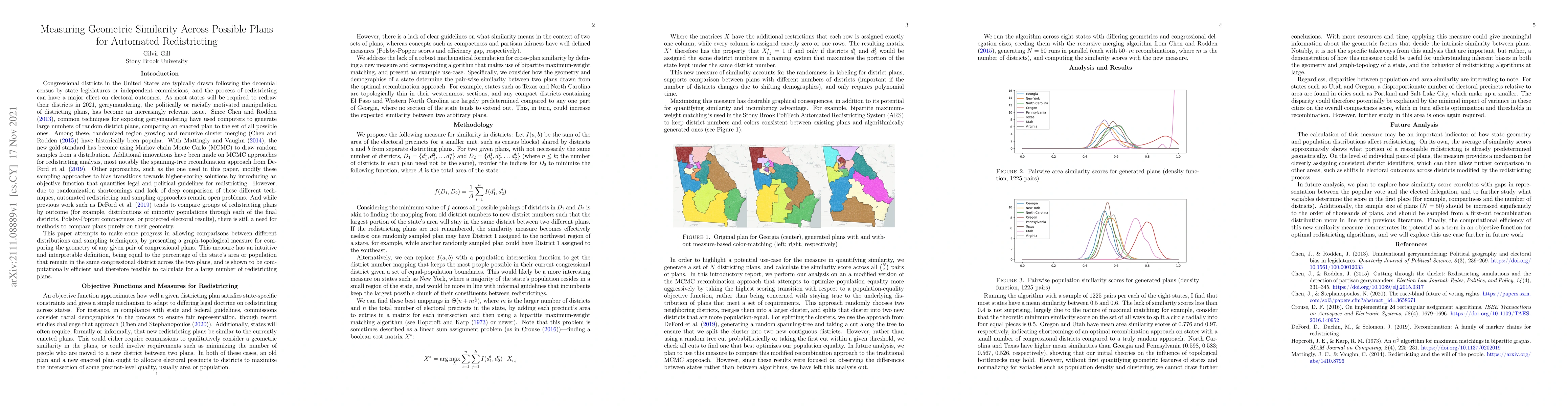 This paper introduces an intuitive measure to quantify geometric similarity between different congressional redistricting plans, using an assignment matrix to determine the percentage of a state's area or population that remains in the same district. The authors demonstrate a polynomial-time calculation method for this measure and discuss potential applications.