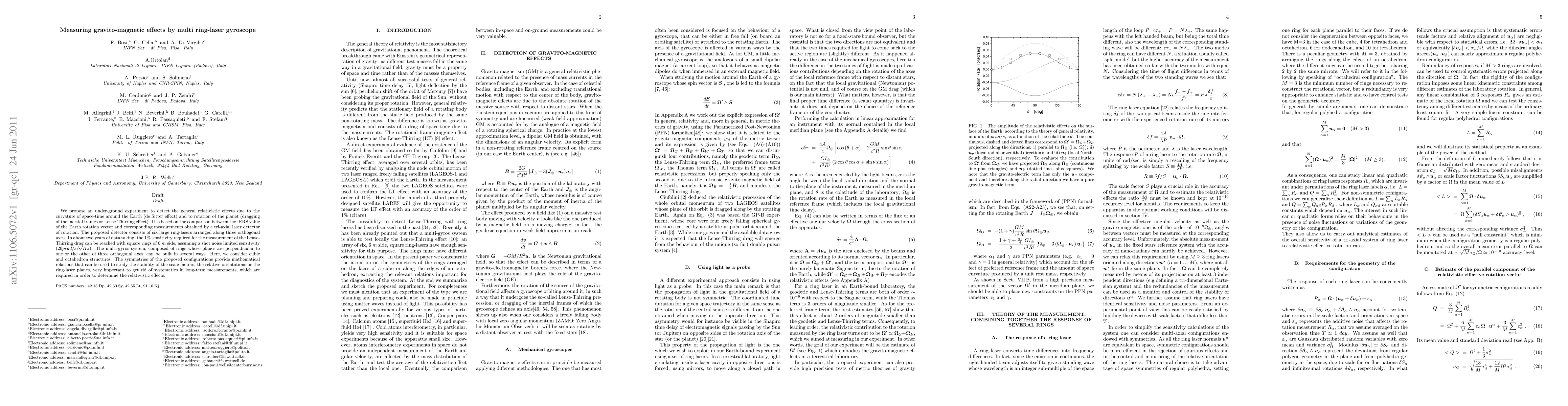 We propose an under-ground experiment to detect the general relativistic effects due to the curvature of space-time around the Earth (de Sitter effect) and to rotation of the planet (dragging of the inertial frames or Lense-Thirring effect). It is based on the comparison between the IERS value of the Earth rotation vector and corresponding measurements obtained by a tri-axial laser detector of rotation. The proposed detector consists of six large ring-lasers arranged along three orthogonal axes. In about two years of data taking, the 1% sensitivity required for the measurement of the Lense-Thirring drag can be reached with square rings of 6 $m$ side, assuming a shot noise limited sensitivity ($ 20 prad/s/\sqrt{Hz}$). The multi-gyros system, composed of rings whose planes are perpendicular to one or the other of three orthogonal axes, can be built in several ways. Here, we consider cubic and octahedron structures. The symmetries of the proposed configurations provide mathematical relations that can be used to study the stability of the scale factors, the relative orientations or the ring-laser planes, very important to get rid of systematics in long-term measurements, which are required in order to determine the relativistic effects.
