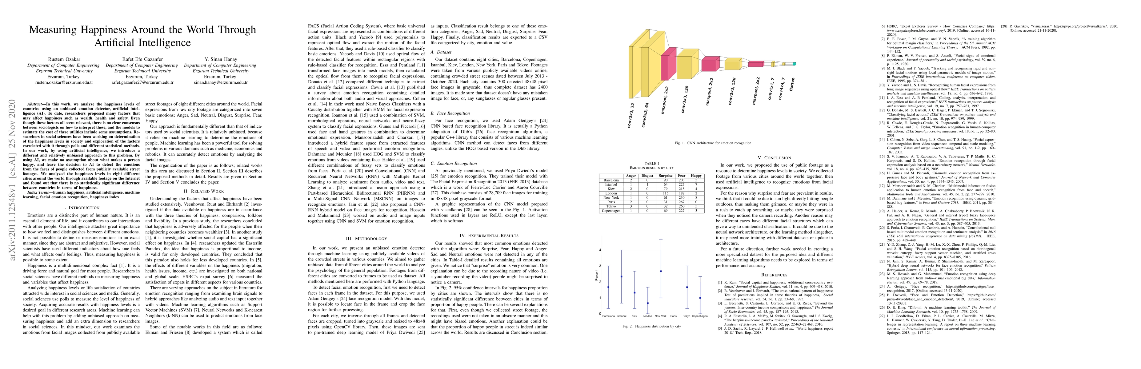 In this work, we analyze the happiness levels of countries using an unbiased emotion detector, artificial intelligence (AI). To date, researchers proposed many factors that may affect happiness such as wealth, health and safety. Even though these factors all seem relevant, there is no clear consensus between sociologists on how to interpret these, and the models to estimate the cost of these utilities include some assumptions. Researchers in social sciences have been working on determination of the happiness levels in society and exploration of the factors correlated with it through polls and different statistical methods. In our work, by using artificial intelligence, we introduce a different and relatively unbiased approach to this problem. By using AI, we make no assumption about what makes a person happy, and leave the decision to AI to detect the emotions from the faces of people collected from publicly available street footages. We analyzed the happiness levels in eight different cities around the world through available footage on the Internet and found out that there is no statistically significant difference between countries in terms of happiness.
