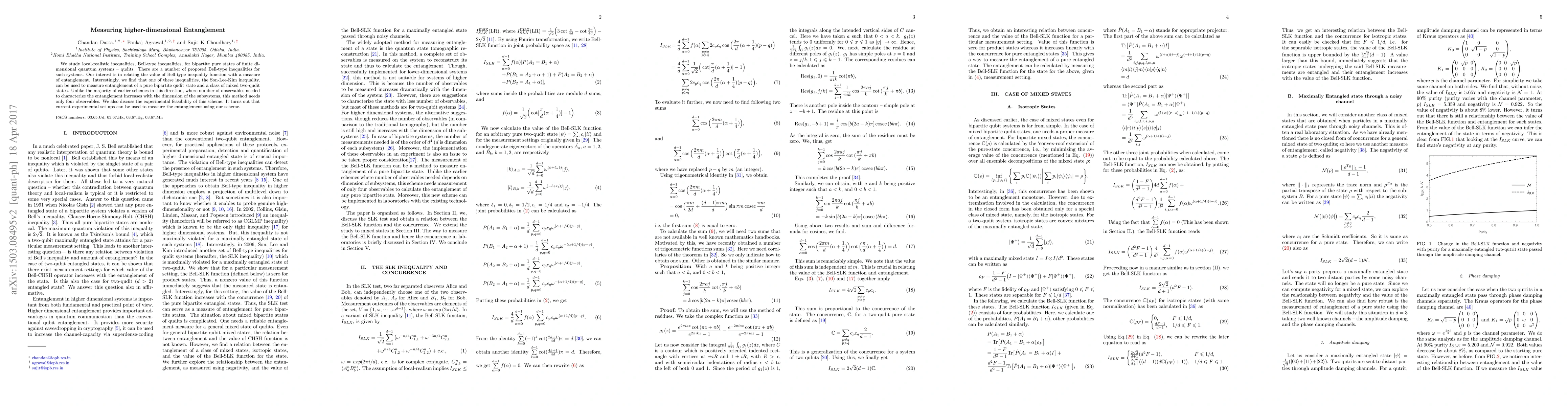 This paper investigates Bell-type inequalities to measure higher-dimensional entanglement in quantum systems, finding that the Son-Lee-Kim inequality can quantify entanglement using only four observables. Current experimental setups are viable for implementing this method.