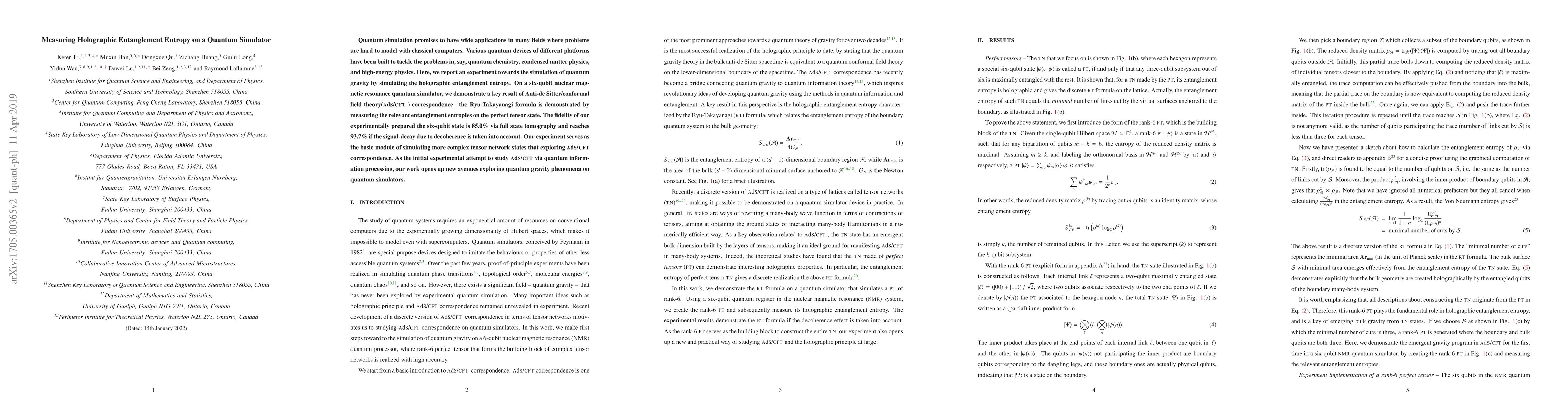 This paper reports an experiment on a six-qubit NMR quantum simulator to simulate holographic entanglement entropy, demonstrating the Ryu-Takayanagi formula of AdS/CFT correspondence. The experiment achieves 85.0% fidelity with improvements to 93.7% accounting for decoherence, paving the way for simulating complex tensor network states and exploring quantum gravity phenomena.