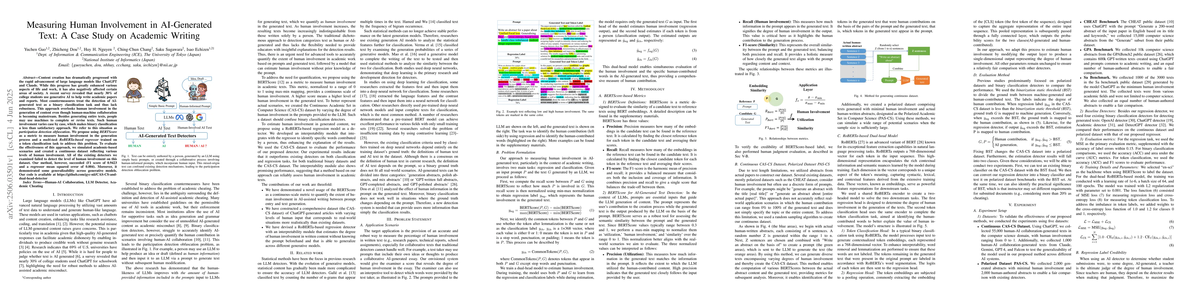 The paper proposes using BERTScore as a metric and a multi-task RoBERTa-based regressor for token classification to measure human involvement in AI-generated text, specifically in academic writing. This approach was evaluated through simulated academic scenarios creating a dataset with varying levels of human involvement.
