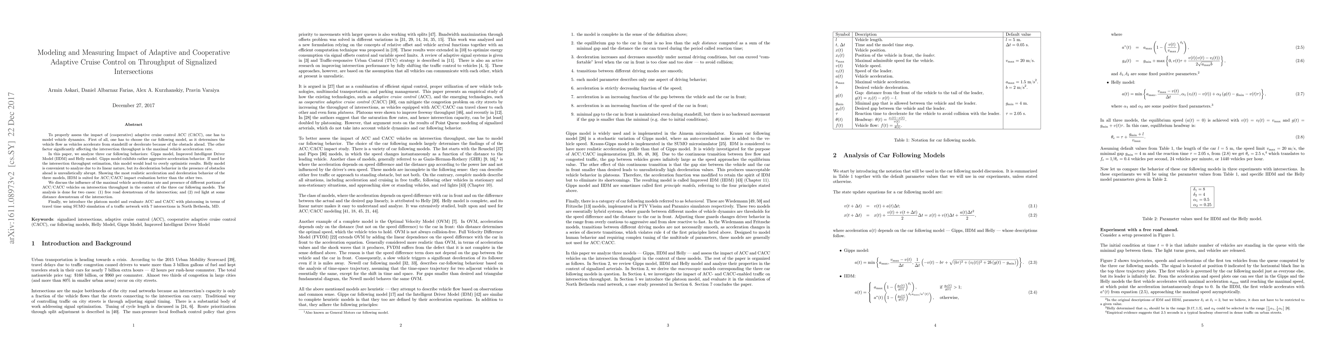 This paper evaluates the impact of adaptive and cooperative adaptive cruise control (ACC/CACC) on the throughput of signalized intersections by analyzing three car following models: Gipps, IIDM, and Helly. The study finds that the Improved Intelligent Driver Model (IIDM) provides the most realistic acceleration and deceleration behavior, making it better suited for assessing ACC/CACC effects. The research also examines the influence of maximal vehicle acceleration rates and varying proportions of ACC/CACC vehicles on intersection throughput, concluding with a simulation study on a 4-mile stretch in Arcadia, Southern California.