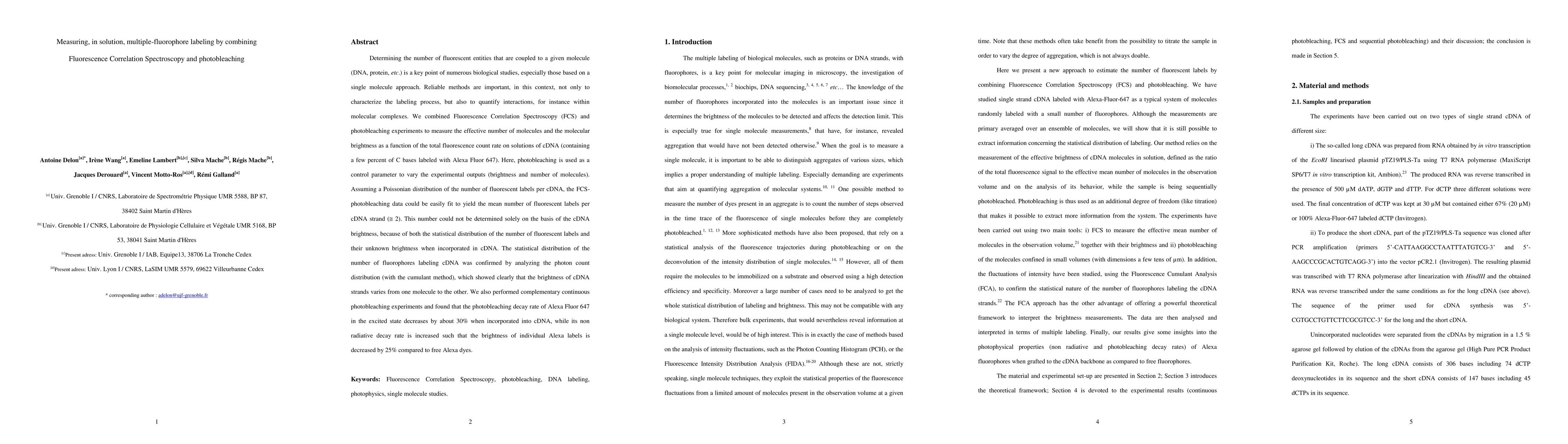 Determining the number of fluorescent entities that are coupled to a given molecule (DNA, protein, etc.) is a key point of numerous biological studies, especially those based on a single molecule approach. Reliable methods are important, in this context, not only to characterize the labeling process, but also to quantify interactions, for instance within molecular complexes. We combined Fluorescence Correlation Spectroscopy (FCS) and photobleaching experiments to measure the effective number of molecules and the molecular brightness as a function of the total fluorescence count rate on solutions of cDNA (containing a few percent of C bases labeled with Alexa Fluor 647). Here, photobleaching is used as a control parameter to vary the experimental outputs (brightness and number of molecules). Assuming a Poissonian distribution of the number of fluorescent labels per cDNA, the FCS-photobleaching data could be easily fit to yield the mean number of fluorescent labels per cDNA strand (@ 2). This number could not be determined solely on the basis of the cDNA brightness, because of both the statistical distribution of the number of fluorescent labels and their unknown brightness when incorporated in cDNA. The statistical distribution of the number of fluorophores labeling cDNA was confirmed by analyzing the photon count distribution (with the cumulant method), which showed clearly that the brightness of cDNA strands varies from one molecule to the other.