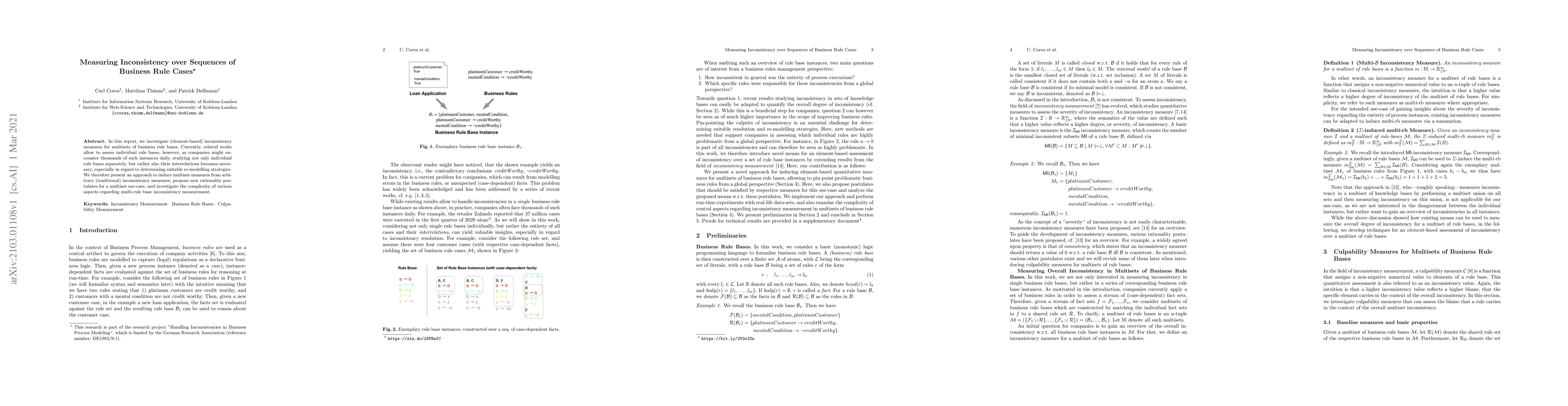 In this report, we investigate (element-based) inconsistency measures for multisets of business rule bases. Currently, related works allow to assess individual rule bases, however, as companies might encounter thousands of such instances daily, studying not only individual rule bases separately, but rather also their interrelations becomes necessary, especially in regard to determining suitable re-modelling strategies. We therefore present an approach to induce multiset-measures from arbitrary (traditional) inconsistency measures, propose new rationality postulates for a multiset use-case, and investigate the complexity of various aspects regarding multi-rule base inconsistency measurement.