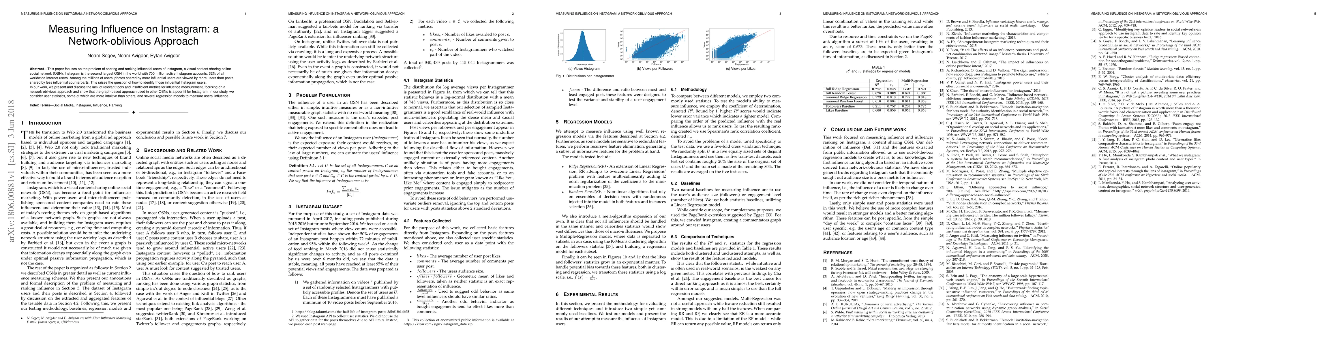 This paper addresses the challenge of identifying influential users on Instagram, highlighting the inadequacy of existing metrics and tools. It proposes a network-oblivious approach, demonstrating that traditional graph-based methods are ineffective for Instagram, and explores user statistics and regression models to better measure influence.
